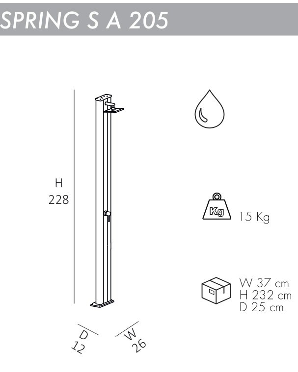 Летний душ Spring S A205с инновационными оригинальнымдизайномидеально подходит для установки как внутри, так и снаружи помещения, для сада, бассейна илипляжного домика.Чистый дизайн, элегантный и заботливый.Душ особенно подходит для использования на открытом воздухе. Установка выполняется без проблем, простое подключение к постоянномуводоснабжению холодной и горячей воды. Особенности: прямая колонна выполнена изалюминияс порошковым антикоррозийным покрытием, которое обеспечивает долгий срок службы и устойчивость кразличным погодным воздействиям. Также к заказу доступен душ с отделкой из нержавеющей стали или с полосой из анодированной стали. Цены Вы можете уточнить у наших менеджеров; водоснабжение: горячая и холодная вода; смеситель горячей и холодной воды. Материал - нержавеющая сталь; душевая насадка; винты для крепления в комплекте; возможность крепления к песку или газону с помощью винта D125 и меламиновой плиты D180 (приобретаются отдельно); дополнительно для алюминиевых душей Arkema доступен фильтр от известкового налета D150 (приобретается отдельно); размер входящей трубы для подключения воды 1,27 см; широкая палитра цветов. Скачать инструкцию по установке. Скачать техническую карту.Характеристики