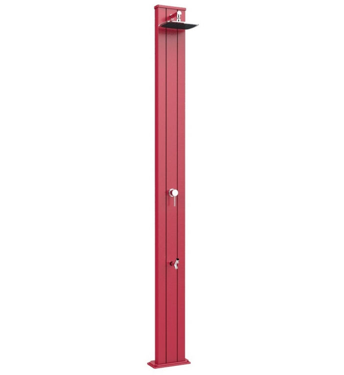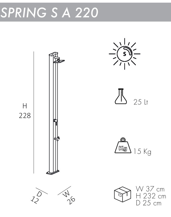 Вдохновленный дизайном коллекции Dada S, но в уменьшенной версии, солнечный душ Spring S A220сочетает в себе элегантность и минималистичность формы и является отличным решением длягостиниц, кемпингов, туристическихили пляжныхкурортов,илидля частного использования.В нижней части корпуса душа находится дополнительный кран, который удобно использовать для мытья ног. Особенности: прямая колонна выполнена изалюминияс порошковым антикоррозийным покрытием, которое обеспечивает долгий срок службы и устойчивость кразличным погодным воздействиям. Также к заказу доступен душ с отделкой из анодированной стали или с полосой из анодированной стали. Цены Вы можете уточнить у наших менеджеров; смеситель горячей воды из бака и холодной воды из источника. Материал - нержавеющая сталь; душевая насадка; кран для мытья ног; емкость для воды на 25л; нагрев воды от солнечных лучей; винты для крепления в комплекте; возможность крепления к песку или газону с помощью винта D125 и меламиновой плиты D180 (приобретаются отдельно); дополнительно для алюминиевых душей Arkema доступен фильтр от известкового налета D150 (приобретается отдельно); размер входящей трубы для подключения воды 1,27 см; широкая палитра цветов. Скачать инструкцию по установке. Скачать техническую карту. Принцип работы максимально прост, что делает солнечный душ популярным атрибутом пляжныхкурортов. Вода, хранящаяся в корпусе душа, нагревается за счет солнца. Нагретая вода смешивается с холодной водой из источника постоянного водоснабжения (или из садового шланга). При помощи смесителя возможна регулировка потокагорячей и холодной воды до температуры комфорта. На зимний период воду из внутреннего бака и шлангов необходимо сливать!Характеристики