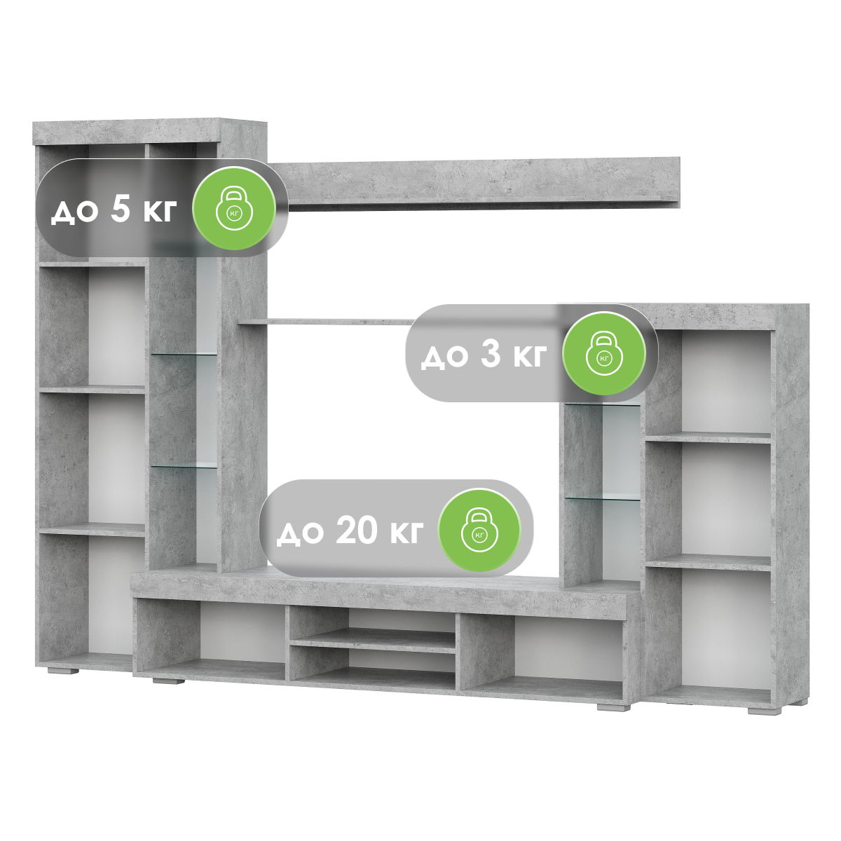 Готовая гостиная Swede, изготовленная из ЛДСП, является интересным и функциональным решением для обустройства гостиной. Она имеет большую нишу под ТВ размером 121 * 82 см, что позволяет разместить телевизор до 47 дюймов. Два закрытых шкафа расположены по обе стороны ниши. Левый шкаф содержит 4 полки внутри, а также 3 стеклянные полки снаружи. Правый шкаф имеет 2 закрытых полки внутри и 2 стеклянные полки. Над нишей расположены две открытые длинные полки, а под ней - 2 закрытых шкафчика и 2 открытые полки.Дизайн готовой гостиной Swede является интересным и необычным, что позволяет ей выделиться среди других готовых гостинных. При выборе готовой гостиной, необходимо учитывать ее размеры и соответствие собственному стилю и потребностям в хранении вещей. Размер ниши под ТВ: 121 х 82 см Габариты упаковки: 1840х360х90, 1785х460х85, 1510х350х75, 910х350х135, 365х205х106
