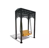 Подвесные уличные качели на цепях подходят для развлечения детей и взрослых. Стационарная металлическая конструкция на четырех опорных столбах с надежными основаниями способна выдержать повышенные нагрузки.