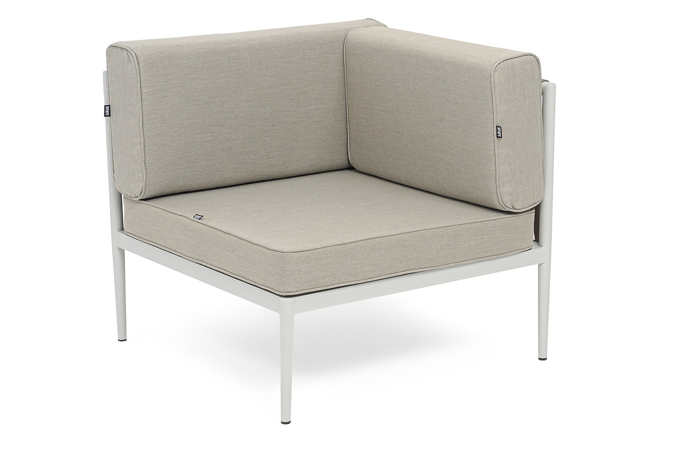 Модуль диванный угловой входит в комплект трансформирующегося дивана «Касабланка». Изготовлен из качественного алюминиевого профиля, окрашенного порошковой краской в светло-серый (RAL7035) цвет. Каркас оплетен плоским роупом, шириной 23 мм, серо-коричневого цвета. Подушки со съёмными влагоотталкивающими чехлами входят в комплект. Размер модуля: 800×800×700 мм.