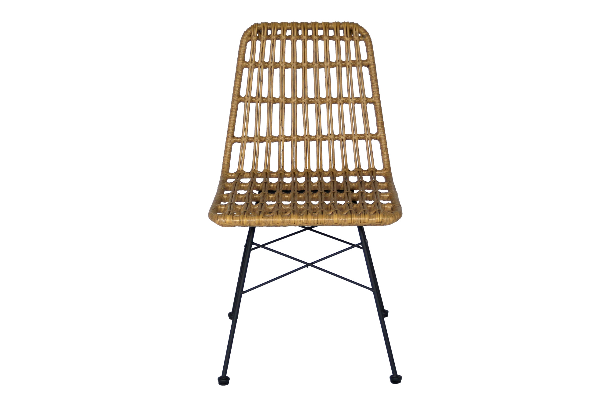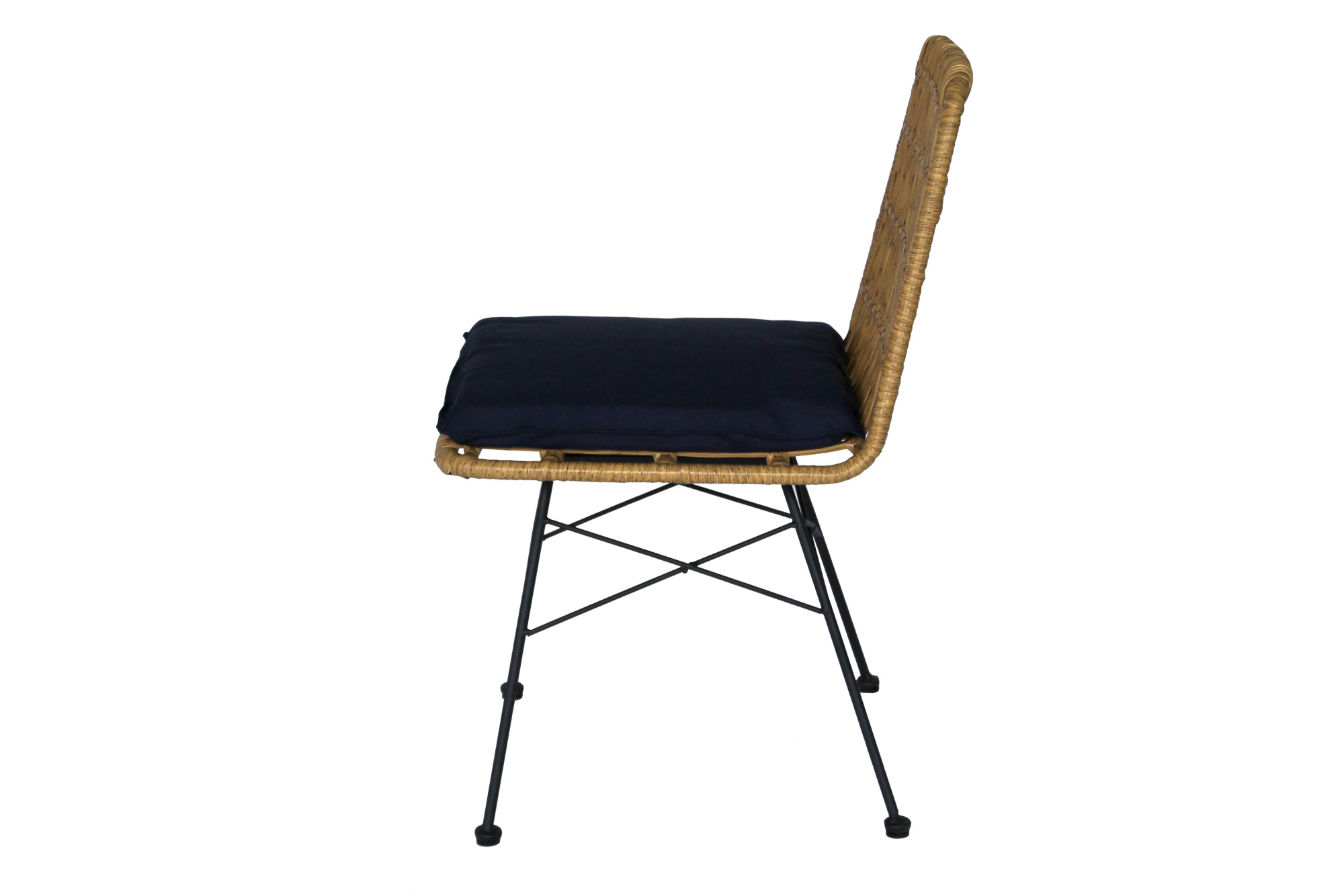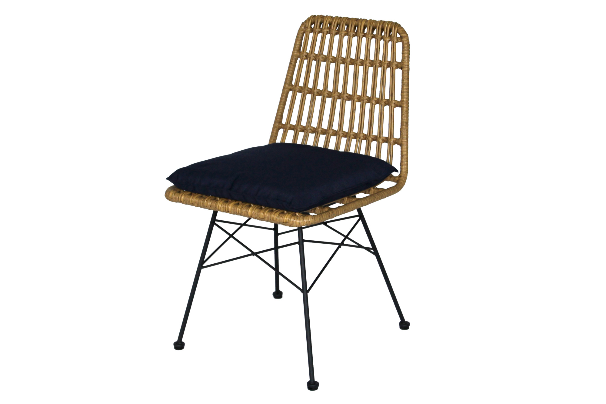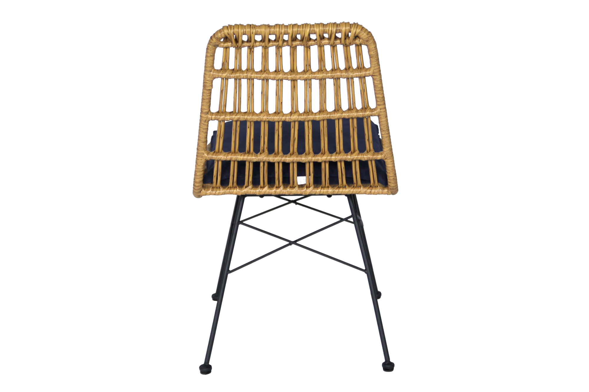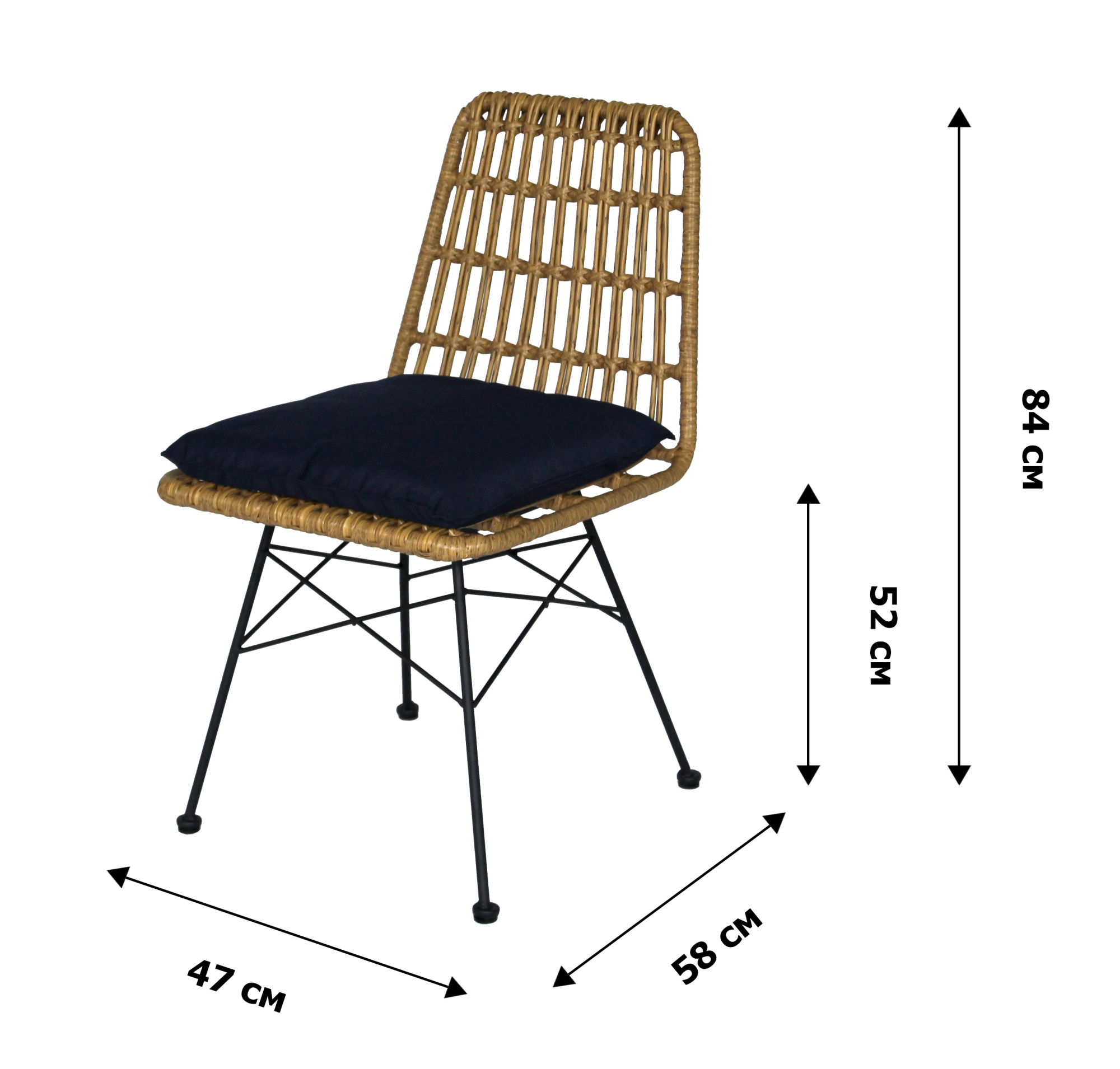 Габариты изделия (Ш/ГхДхВ) : 47х58х84 Цвет каркаса : черный Материал каркаса : сталь Покрытие : краска порошковая полимерная Цвет поверхности : бежевый Дополнительно : (каркас черный, ротанг бежевый, подушка синяя). Коробка с двумя стульями 60х50х55 смХарактеристики