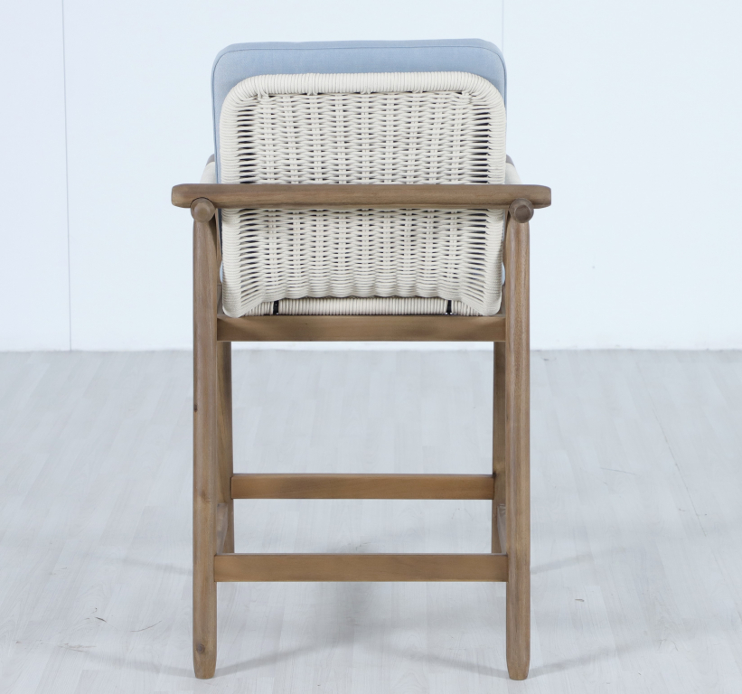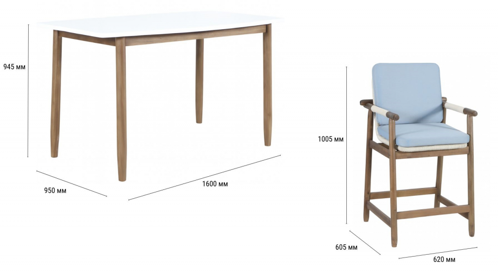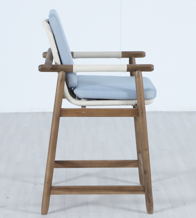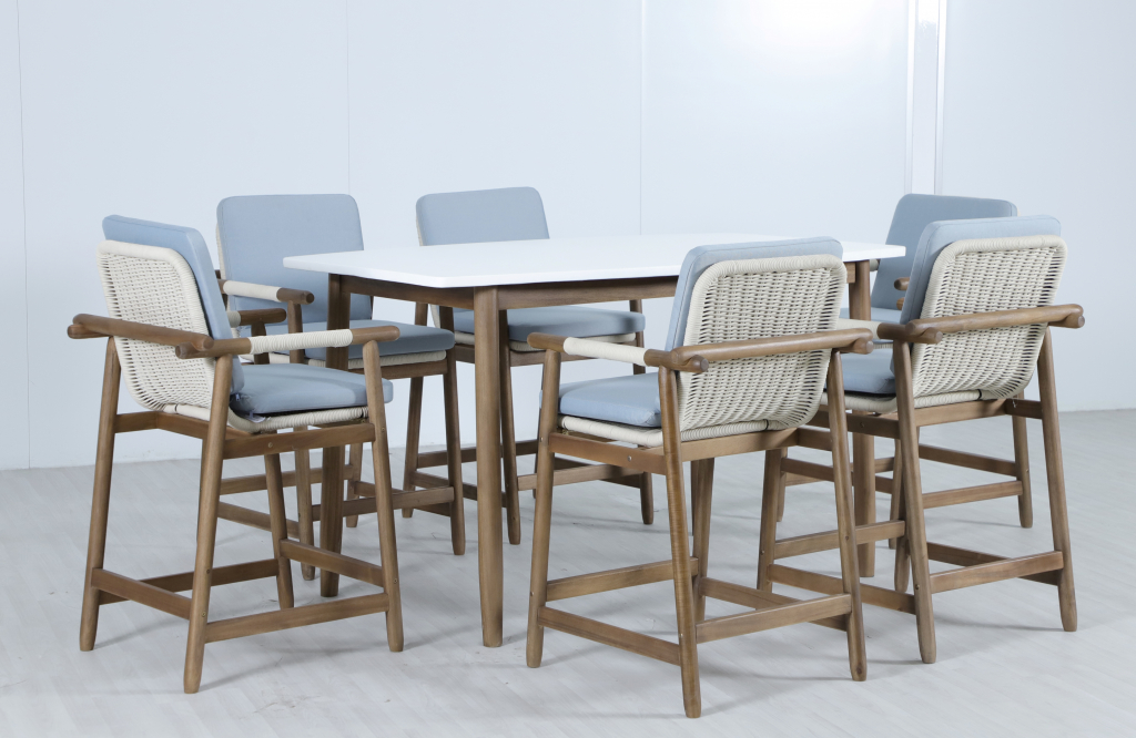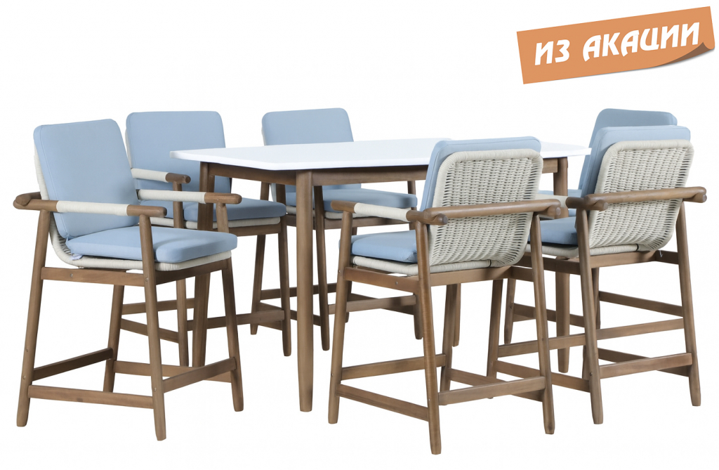 Барная группаApoyo на 6 персон - это стильная коллекция уличной мебели из массива АКАЦИИ, в которой сочетаются натуральное верёвочное (роуп) плетение, тёплая текстура дерева и комфортные подушки.Комплект барной мебели состоит из шести полубарных комфортных кресел и барного стола. Превосходноерешение для террасы или веранды, подходящее для тех, кто ценит долговечность и эстетический вид уличной мебели. Особенности: Материал - АКАЦИЯ, отделка экомаслом грецкий орехTPW #4. Веревочное плетение роуп VPR - PR388на спинке,сиденье и подлокотниках излучает стиль в сочетании с деревянными поверхностями. Древесина, из которой изготовлена мебель, имеет сертификацию FSC (Forest Stewardship Council) - гарантия качества и происхождения древесины. Знак FSC - показатель того, что продукция происходит из леса, в котором ведется экологически и социально ответственное лесное хозяйство. Благодаря своей долговечности, прочности и устойчивости к вредителям эта древесина была создана для изготовления садовой мебели. Страна происхождения древесины: Вьетнам, Малайзия. Средняя плотность древесины: 550 кг/м³. Столешницастола выполнена из искусственного камняCement OFF WHITE. Коррозионно-стойкая, анодированная фурнитура из нержавеющей стали. Подушки в комплекте, ткань подушек - олефин, наполнитель - толстый поролон. Материалы устойчивы к УФ-излучению и другим погодным воздействиям. Цвет подушек - голубой W1887-980. Состав комплекта: Кресло полубарное, размер: 620х605х1005 мм - 6шт. Барный стол(подстолье1600х950х920 мм + столешница1600х950х25 мм )- 1 шт. Данные упаковки: Подстолье: Вес нетто: 14.2кг.Вес брутто: 18 кг. Размер упаковки: 1350х750х155 мм. Объем упаковки: 0.157м³. Количество в упаковке: 1 шт. Столешница: Вес нетто: 57 кг.Вес брутто: 70 кг. Размер упаковки: 1725х1075х130 мм. Объем упаковки: 0.241 м³. Количество в упаковке: 1 шт. Открыть инструкцию по уходу. Вся деревянная мебель должна обрабатываться специальным маслом или пропиткой минимум 1 раз в 6 месяцев (в условиях высокой влажности обработку следует проводить чаще). Для данной мебели не рекомендуются резкие температурные перепады. Дерево является натуральным материалом, поэтому любые трещины, неравномерные природные рисунки, различность оттенков ‐ являются естественным процессом, который вызван температурными изменениями или влажностью.Характеристики