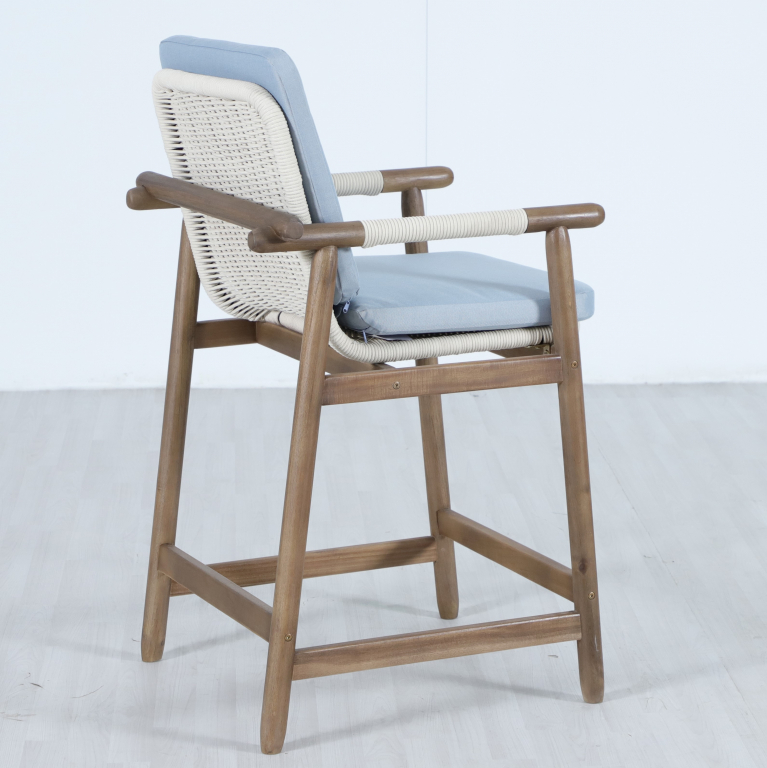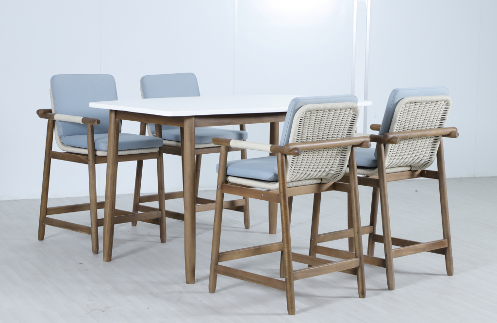 Барная группаApoyo на 4 персоны- это стильная коллекция уличной мебели из массива АКАЦИИ, в которой сочетаются натуральное верёвочное (роуп) плетение, тёплая текстура дерева и комфортные подушки. Комплект барной мебели состоит из четырех полубарных комфортных кресел и барного стола. Превосходноерешение для террасы или веранды, подходящее для тех, кто ценит долговечность и эстетический вид уличной мебели. Особенности: Материал - АКАЦИЯ, отделка экомаслом грецкий орехTPW #4. Веревочное плетение роуп VPR - PR388на спинке,сиденье и подлокотниках излучает стиль в сочетании с деревянными поверхностями. Древесина, из которой изготовлена мебель, имеет сертификацию FSC (Forest Stewardship Council) - гарантия качества и происхождения древесины. Знак FSC - показатель того, что продукция происходит из леса, в котором ведется экологически и социально ответственное лесное хозяйство. Благодаря своей долговечности, прочности и устойчивости к вредителям эта древесина была создана для изготовления садовой мебели. Страна происхождения древесины: Вьетнам, Малайзия. Средняя плотность древесины: 550 кг/м³. Столешницастола выполнена из искусственного камняCement OFF WHITE. Коррозионно-стойкая, анодированная фурнитура из нержавеющей стали. Подушки в комплекте, ткань подушек - олефин, наполнитель - толстый поролон. Материалы устойчивы к УФ-излучению и другим погодным воздействиям. Цвет подушек - голубой W1887-980. Состав комплекта: Кресло полубарное, размер: 620х605х1005 мм - 4шт. Барный стол(подстолье1600х950х920 мм + столешница1600х950х25 мм )- 1 шт. Данные упаковки: Креслополубарное: Вес нетто: 37.52 кг. Вес брутто: 47.5кг. Размер упаковки: 975х775х700 мм. Объем упаковки: 0.132 м³. Количество в упаковке: 4 шт. Подстолье: Вес нетто: 14.2кг.Вес брутто: 18 кг. Размер упаковки: 1350х750х155 мм. Объем упаковки: 0.157м³. Количество в упаковке: 1 шт. Столешница: Вес нетто: 57 кг.Вес брутто: 70 кг. Размер упаковки: 1725х1075х130 мм. Объем упаковки: 0.241 м³. Количество в упаковке: 1 шт. Открыть инструкцию по уходу. Вся деревянная мебель должна обрабатываться специальным маслом или пропиткой минимум 1 раз в 6 месяцев (в условиях высокой влажности обработку следует проводить чаще). Для данной мебели не рекомендуются резкие температурные перепады. Дерево является натуральным материалом, поэтому любые трещины, неравномерные природные рисунки, различность оттенков ‐ являются естественным процессом, который вызван температурными изменениями или влажностью.Характеристики