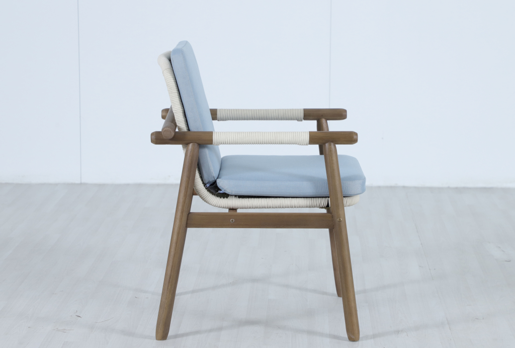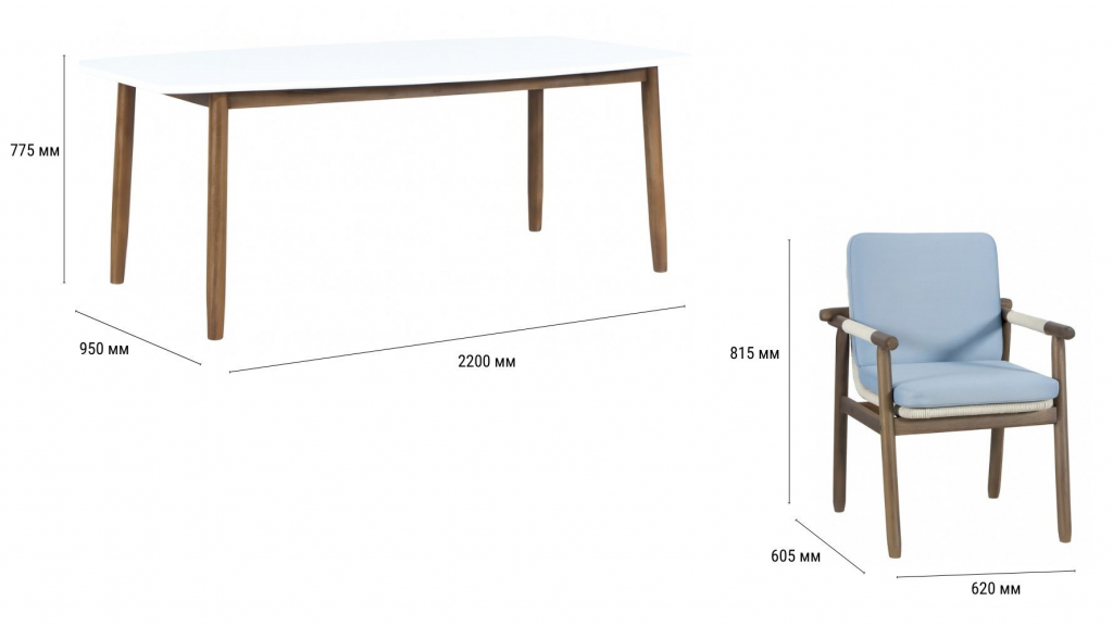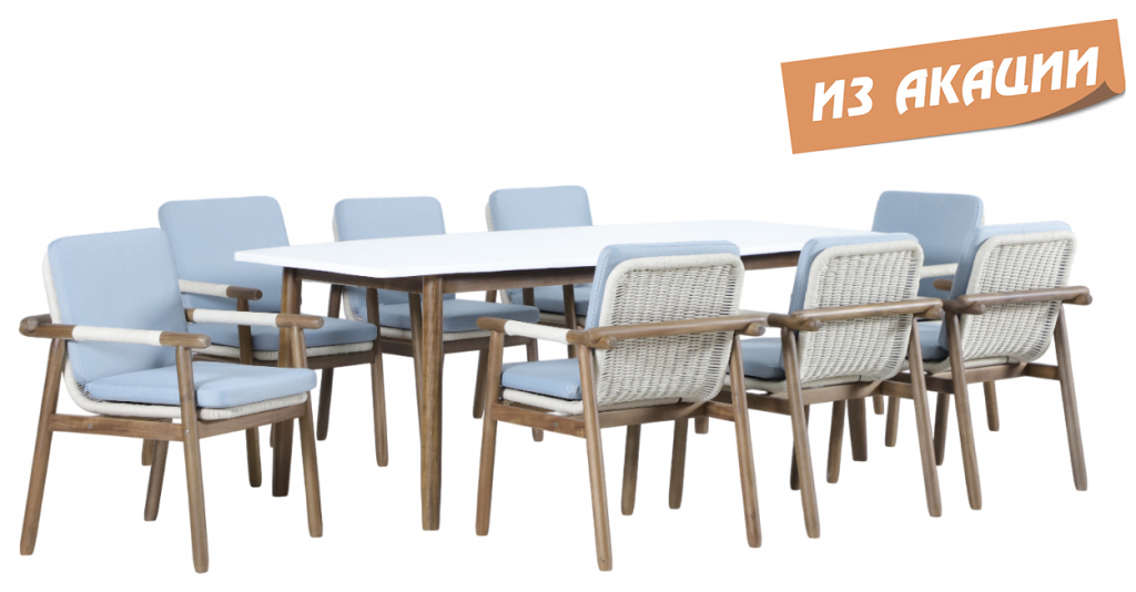 Обеденная группаApoyo на 8 персон - это стильная коллекция уличной мебели из массива АКАЦИИ, в которой сочетаются натуральное верёвочное (роуп) плетение, тёплая текстура дерева и комфортные подушки. Превосходноерешение для террасы или веранды, подходящее для тех, кто ценит долговечность и эстетический вид уличной мебели. Особенности: Материал - АКАЦИЯ, отделка экомаслом грецкий орехTPW #4. Веревочное плетение роупVPR - PR388 на спинке,сиденье и подлокотниках излучает стиль в сочетании с деревянными поверхностями. Древесина, из которой изготовлена мебель, имеет сертификацию FSC (Forest Stewardship Council) - гарантия качества и происхождения древесины. Знак FSC - показатель того, что продукция происходит из леса, в котором ведется экологически и социально ответственное лесное хозяйство. Благодаря своей долговечности, прочности и устойчивости к вредителям эта древесина была создана для изготовления садовой мебели. Страна происхождения древесины: Вьетнам, Малайзия. Средняя плотность древесины: 550 кг/м³. Столешницастола выполнена из искусственного камня Cement OFF WHITE. Коррозионно-стойкая, анодированная фурнитура из нержавеющей стали. Подушки в комплекте, ткань подушек - олефин, наполнитель - толстый поролон. Материалы устойчивы к УФ-излучению и другим погодным воздействиям. Цвет подушек - голубойW1887-980 Состав комплекта: Кресло, размер: 620х605х815 мм - 8шт. Обеденный стол(подстолье2200х950х750 мм + столешница 2200х950х25 мм )- 1 шт. Данные упаковки: Кресло: Вес нетто: 31.04кг.Вес брутто: 36кг. Размер упаковки: 660х690х880 мм. Объем упаковки: 0.100 м³. Количество в упаковке: 4шт. Кресло: Вес нетто: 31.04кг.Вес брутто: 36кг. Размер упаковки: 660х690х880 мм. Объем упаковки: 0.100 м³. Количество в упаковке: 4шт. Подстолье: Вес нетто: 16.4кг.Вес брутто: 21кг. Размер упаковки: 1850х750х145 мм. Объем упаковки: 0.201 м³. Количество в упаковке: 1 шт. Столешница: Вес нетто: 78.38кг.Вес брутто: 91.38кг. Размер упаковки: 2325х1075х130 мм. Объем упаковки: 0.325м³. Количество в упаковке: 1 шт. Открыть инструкцию по уходу. Вся деревянная мебель должна обрабатываться специальным маслом или пропиткой минимум 1 раз в 6 месяцев (в условиях высокой влажности обработку следует проводить чаще). Для данной мебели не рекомендуются резкие температурные перепады. Дерево является натуральным материалом, поэтому любые трещины, неравномерные природные рисунки, различность оттенков ‐ являются естественным процессом, который вызван температурными изменениями или влажностью.Характеристики