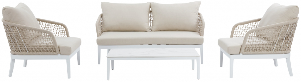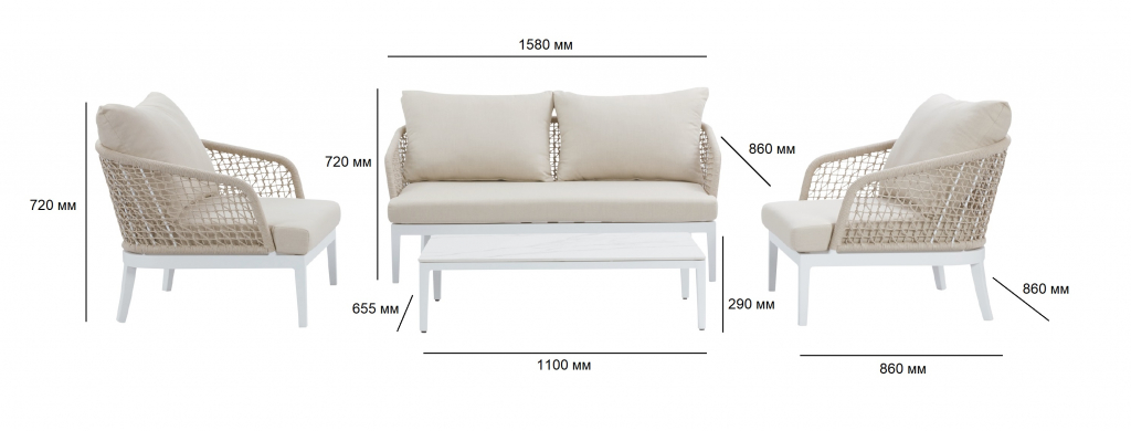 Комплект уличной мебели для отдыха Buenos представляет собой стильное и удобное решение для Вашего открытого пространства. Набор включает в себя два кресла, двухместный диван и кофейный столик, создавая идеальное место для отдыха на свежем воздухе. Каркас кресел и дивана изготовлен из прочного алюминия, который обеспечивает надежную поддержку и долговечность. Плетение из изящной веревки придает мебели современный и элегантный вид. Все подушки комплекта выполнены из погодостойкого акрила, что обеспечивает комфорт и сохраняет свою привлекательность даже при воздействии различных погодных условий. Кофейный столик изготовлен из алюминиевого каркаса с элегантной столешницей из керамики. С уличным комплектом Buenos сад, балкон или терраса преобразятся в уютное пространство для отдыха, где Вы сможете наслаждаться природой в стильном и комфортабельном окружении. Особенности: Каркас мебели выполнен из алюминия, который является одним из наиболее коррозионно-стойких металлов. Алюминий имеет защитное порошковое покрытие, которое предотвращает коррозию и делает этот материал подходящим для наружного применения. Уникальное плетение из высококачественной водостойкой веревки (олефин) придает мебели утонченный вид, подчеркивая ее современный стиль. Обивка подушек выполнена из окрашенного погодостойкого акрила. Наполнитель подушек для сиденья в диване и креслах: поролон плотностью 25 кг/м3. Наполнитель подушек для спинки: 100% полиэстер дакрон. Столешница кофейного столика выполнена из керамики. Все материалы устойчивы к УФ-излучению и другим погодным воздействиям. Состав комплекта: Кресло лаунж с подушками (арт. TAG/11415), размер: 860х860х720 мм - 2 шт. Диван 2-х местный с подушками (арт. TAG/11423), размер: 1580х860х720 мм - 1 шт. Кофейный столик (арт. TAG/11431), размер: 1100х655х290 мм - 1 шт. Открыть палитру материалов. Открыть инструкцию по уходу. Для уточнения всех возможных вариантов материала и цвета данного изделия обращайтесь к нашим менеджерам.Характеристики