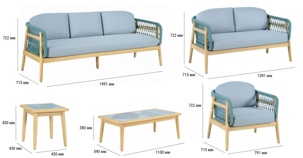 Cambria - это современная серия уличной мебели, объединяющая натуральную тёплую текстуру ТИКА, верёвочное плетение роуп и комфортные съёмные подушки. Комплект для отдыха состоит из двухместного и трехместного диванов, двух комфортных кресел, двух журнальныхстоликов. Коллекция разработана для открытых пространств - террас, веранд и садовых зон отдыхаи ориентирована на тех, кто ценит долговечность, премиальный вид и минимальный уход. Особенности: Материал - массив ТИКА. отделка экомаслом натуральный. Тик - это лиственное дерево твердых пород, которое происходит из высокогорья. Никакая другая древесина не обладает такой исключительной прочностью и долговечностью, как тик. Его уникальная текстура и кожистый запах обусловлены высоким содержанием масла. Эти характеристики в сочетании с высокой плотностью древесины предотвращают коробление и гниение, позволяя мебели оставаться на открытом воздухе в любых условиях без ухода или защитных средств. Веревочное плетение роуп VPR - PR 730 толщиной 6 ммизлучает стиль в сочетании с деревянными поверхностями. Древесина, из которой изготовлена мебель, имеет сертификацию FSC (Forest Stewardship Council) - гарантия качества и происхождения древесины. Знак FSC - показатель того, что продукция происходит из леса, в котором ведется экологически и социально ответственное лесное хозяйство. Благодаря своей долговечности, прочности и устойчивости к вредителям эта древесина была создана для изготовления садовой мебели. Столешница из тика, вставка RAL 200 40 25 / RAL 180 90 05. Коррозионно-стойкая, анодированная фурнитура из нержавеющей стали. Подушки в комплекте, ткань подушек - олефин, наполнитель - толстый поролон. Материалы устойчивы к УФ-излучению и другим погодным воздействиям. Цвет подушек - Malmo 72. Состав комплекта: Кресло лаунж с подушками, размер: 791х715х722мм - 2шт. Диван двухместный с подушками, размер: 1391х715х722мм - 1шт. Диван трехместный с подушками, размер: 1991х715х722мм - 1шт. Столик кофейный,размер: 1100х590х380мм - 1 шт. Столик кофейный,размер: 450х450х450мм - 1 шт. Данные упаковки: Кресло лаунж 1: Вес нетто: 14 кг.Вес брутто: 18кг. Размер упаковки: 745х745х615 мм. Объем упаковки: 0.341м³. Количество в упаковке: 1шт. Кресло лаунж 2: Вес нетто: 14 кг.Вес брутто: 18кг. Размер упаковки: 745х745х615 мм. Объем упаковки: 0.341м³. Количество в упаковке: 1шт. Диван двухместный: Вес нетто: 23кг.Вес брутто: 30.5кг. Размер упаковки: 1350х745х565 мм. Объем упаковки: 0.568 м³. Количество в упаковке: 1шт. Диван трехместный: Вес нетто: 30кг.Вес брутто: 39.5кг. Размер упаковки: 1950х745х565 мм. Объем упаковки: 0.821 м³. Количество в упаковке: 1шт. Столик кофейный: Вес нетто: 14кг.Вес брутто: 16.5кг. Размер упаковки: 1150х640х125 мм. Объем упаковки: 0.092м³. Количество в упаковке: 1 шт. Столик кофейный: Вес нетто: 10кг.Вес брутто: 11.5кг. Размер упаковки: 500х500х175 мм. Объем упаковки: 0.044м³. Количество в упаковке: 1 шт. Открыть инструкцию по уходу. Вся деревянная мебель должна обрабатываться специальным маслом или пропиткой минимум 1 раз в 6 месяцев (в условиях высокой влажности обработку следует проводить чаще). Для данной мебели не рекомендуются резкие температурные перепады. Дерево является натуральным материалом, поэтому любые трещины, неравномерные природные рисунки, различность оттенков ‐ являются естественным процессом, который вызван температурными изменениями или влажностью.Характеристики