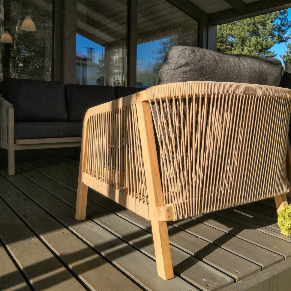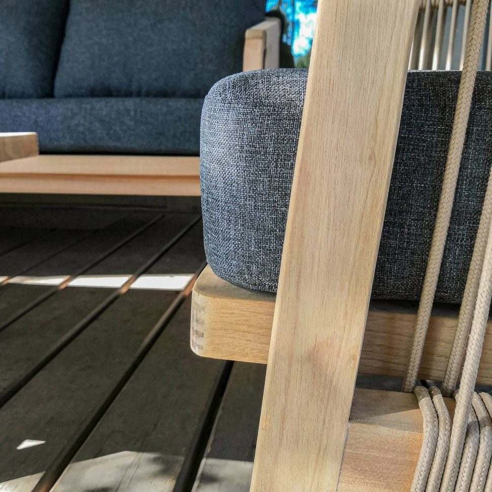 В коллекции ЛЕОНОРЕН гармонично сочетается натуральный цвет тикового дерева и завоевавшие в последнее время среди дизайнеров и потребителей с утонченным вкусом, технологии изготовления плетеной уличной мебели с использованием роупа. Это универсальное сочетание материалов с точки зрения прочности, эластичности, устойчивости к атмосферным воздействиям, долговечности, универсальности, качества и стиля для использования вне помещений. Мебель оснащена подушками из премиальной водоотталкивающей ткани серого цвета, который выгодно подчеркивает красоту тикового дерева, чехлы съемные. Ткань, кроме того, что обладает водоотталкивающим эффектом, устойчива к ультрафиолету, т.к. содержит акрил, что дает ей защиту от выгорания при прямом попадании солнечных лучей.