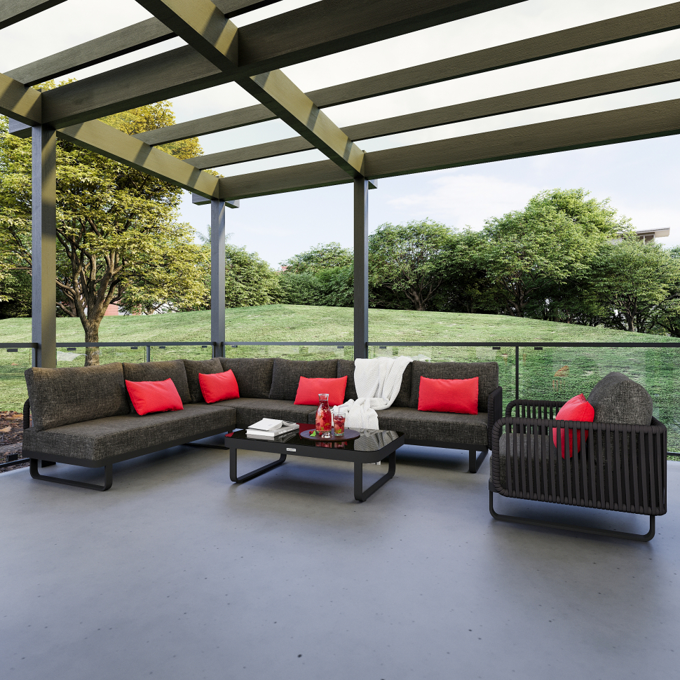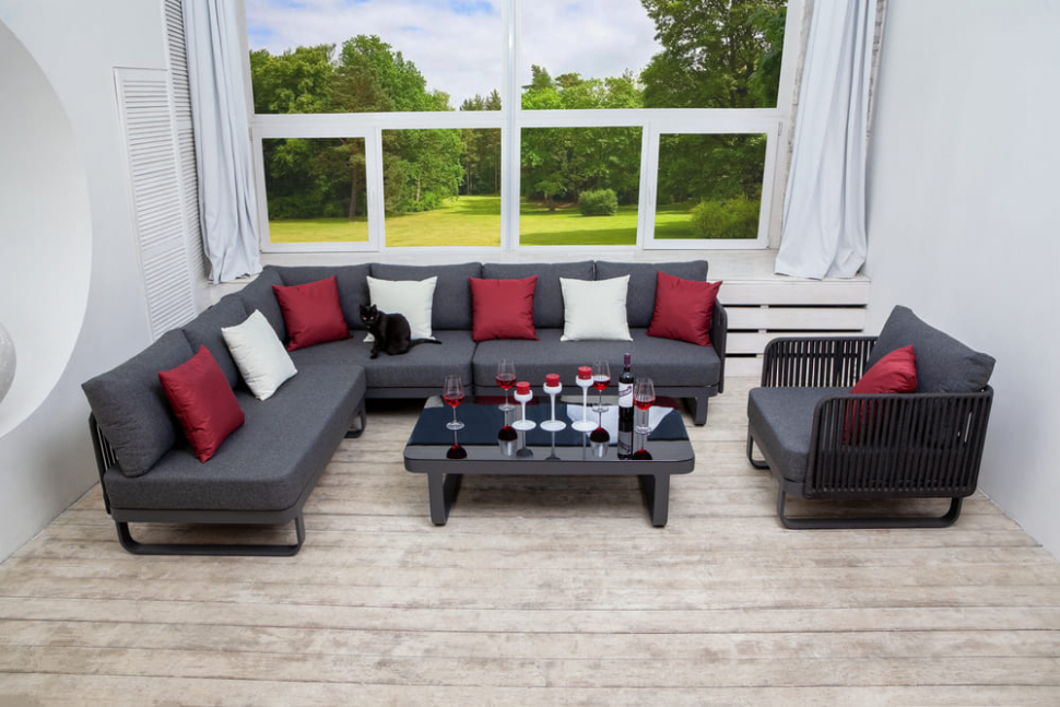 Материалы: всесезонный алюминий, ткань для улицы, закаленное стекло, веревочное плетение (РОУП)