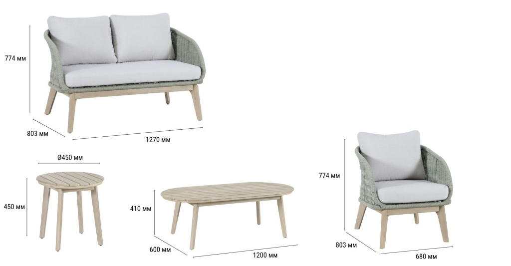 Madrague - это элегантная коллекция уличной мебели из АКАЦИИ, выполненная в комбинацииверевочного плетения роуп, акации и комплектом устойчивых к погоде подушек. Комплект для отдыха состоит из двухместного дивана, двух комфортных кресел и двух журнальныхстоликов. Идеальна для террасы, веранды или комфортной зоны на открытом воздухе - сочетает эстетичный внешний вид, прочность и простой уход. Особенности: Материал - АКАЦИЯ, отделка экомаслом тик Light #01A. Веревочное плетение роупDPC 1783на спинке, сиденье и подлокотниках излучает стиль в сочетании с деревянными поверхностями. Древесина, из которой изготовлена мебель, имеет сертификацию FSC (Forest Stewardship Council) - гарантия качества и происхождения древесины. Знак FSC - показатель того, что продукция происходит из леса, в котором ведется экологически и социально ответственное лесное хозяйство. Благодаря своей долговечности, прочности и устойчивости к вредителям эта древесина была создана для изготовления садовой мебели. Страна происхождения древесины: Вьетнам, Малайзия. Средняя плотность древесины: 550 кг/м³. Анодированная фурнитура из нержавеющей стали. Подушки в комплекте, ткань подушек - олефин, наполнитель - толстый поролон. Материалы устойчивы к УФ-излучению и другим погодным воздействиям. Столешница стола выполнена из массива акации. Цвет подушек - бежевый B103175. Состав комплекта: Кресло лаунж с подушками, размер: 680х803х774мм - 2шт. Диван двухместный с подушками, размер: 1270х803х774 мм - 1шт. Столик кофейный,размер: 1200х600х410мм - 1 шт. Столик кофейный,размер: Ø450х450мм - 1 шт. Данные упаковки: Кресло лаунж: Вес нетто: 26 кг.Вес брутто: 36кг. Размер упаковки: 820х880х825 мм. Объем упаковки: 0.298 м³. Количество в упаковке: 2шт. Диван двухместный: Вес нетто: 25кг.Вес брутто: 32кг. Размер упаковки: 1310х790х595 мм. Объем упаковки: 0.616 м³. Количество в упаковке: 1шт. Столик кофейный: Вес нетто: 54 кг.Вес брутто: 66 кг. Размер упаковки: 1245х645х95 мм. Объем упаковки: 0.076 м³. Количество в упаковке: 1 шт. Столик кофейный: Вес нетто: 4кг.Вес брутто: 5кг. Размер упаковки: 495х495х100мм. Объем упаковки: 0.025м³. Количество в упаковке: 1 шт. Открыть инструкцию по уходу. Вся деревянная мебель должна обрабатываться специальным маслом или пропиткой минимум 1 раз в 6 месяцев (в условиях высокой влажности обработку следует проводить чаще). Для данной мебели не рекомендуются резкие температурные перепады. Дерево является натуральным материалом, поэтому любые трещины, неравномерные природные рисунки, различность оттенков ‐ являются естественным процессом, который вызван температурными изменениями или влажностью.Характеристики