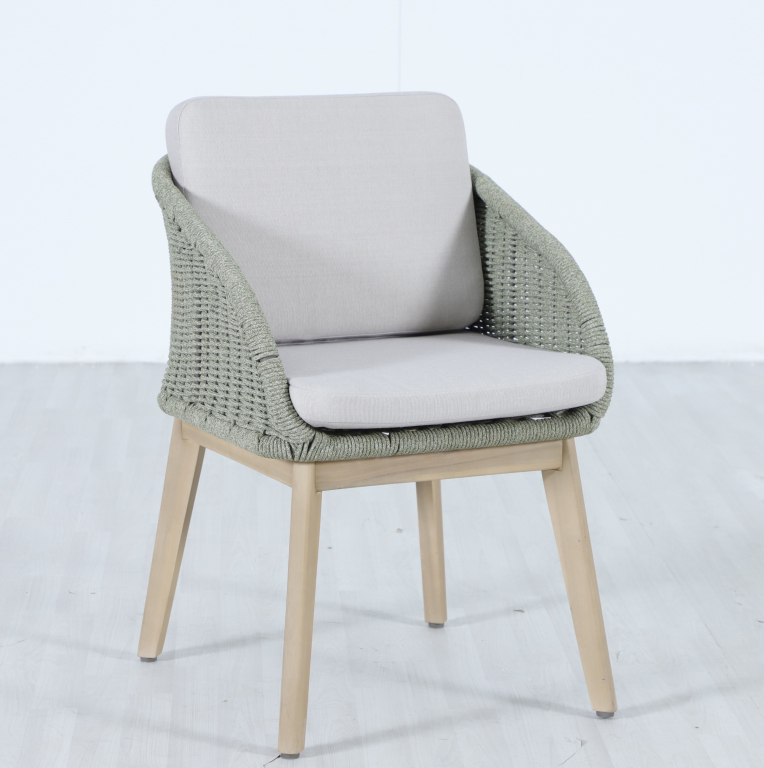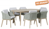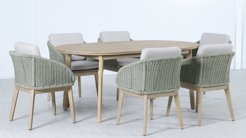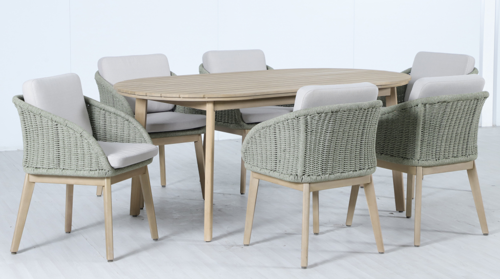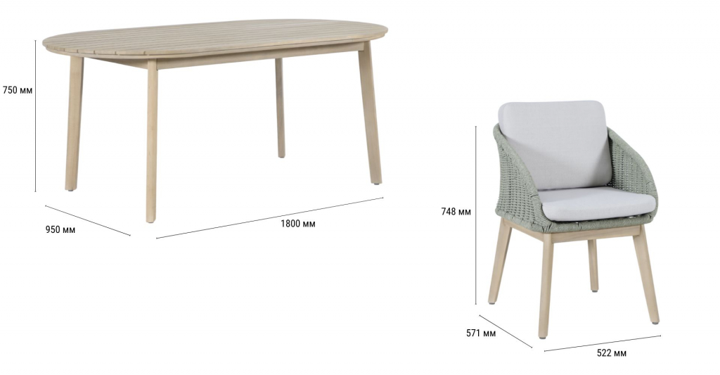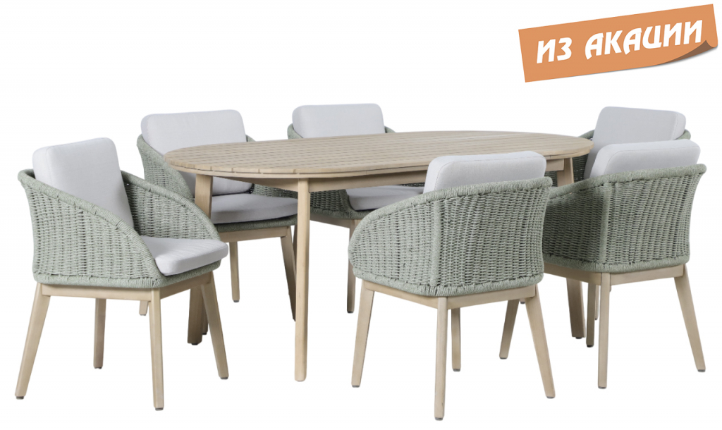 Обеденная группа Madrague на 6 персон - это элегантная коллекция уличной мебели из АКАЦИИ, выполненная в комбинацииверевочного плетения роуп, акации и комплектом устойчивых к погоде подушек. Идеальна для террасы, веранды или комфортной зоны на открытом воздухе — сочетает эстетичный внешний вид, прочность и простой уход. Особенности: Материал - АКАЦИЯ, отделка экомаслом тик Light #01A. Веревочное плетение роупDPC 1783на спинке, сиденье и подлокотниках излучает стиль в сочетании с деревянными поверхностями. Древесина, из которой изготовлена мебель, имеет сертификацию FSC (Forest Stewardship Council) - гарантия качества и происхождения древесины. Знак FSC - показатель того, что продукция происходит из леса, в котором ведется экологически и социально ответственное лесное хозяйство. Благодаря своей долговечности, прочности и устойчивости к вредителям эта древесина была создана для изготовления садовой мебели. Страна происхождения древесины: Вьетнам, Малайзия. Средняя плотность древесины: 550 кг/м³. Столешница стола выполнена из массива акации. Анодированная фурнитура из нержавеющей стали. Подушки в комплекте, ткань подушек - олефин, наполнитель - толстый поролон. Материалы устойчивы к УФ-излучению и другим погодным воздействиям. Цвет подушек - светло-серый B103175. Состав комплекта: Креслос подушками, размер: 522х571х748 мм - 6шт. Стол обеденный,размер: 1800х950х750мм - 1 шт. Данные упаковки: Кресло: Вес нетто: 16 кг.Вес брутто: 19.5 кг. Размер упаковки: 645х660х625 мм. Объем упаковки: 0.133м³. Количество в упаковке: 2шт. Кресло: Вес нетто: 16 кг.Вес брутто: 19.5 кг. Размер упаковки: 645х660х625 мм. Объем упаковки: 0.133м³. Количество в упаковке: 2шт. Кресло: Вес нетто: 16 кг.Вес брутто: 19.5 кг. Размер упаковки: 645х660х625 мм. Объем упаковки: 0.133м³. Количество в упаковке: 2шт. Столобеденный: Вес нетто: 24 кг.Вес брутто: 29кг. Размер упаковки: 1845х995х110 мм. Объем упаковки: 0.202 м³. Количество в упаковке: 1 шт. Открыть инструкцию по уходу. Вся деревянная мебель должна обрабатываться специальным маслом или пропиткой минимум 1 раз в 6 месяцев (в условиях высокой влажности обработку следует проводить чаще). Для данной мебели не рекомендуются резкие температурные перепады. Дерево является натуральным материалом, поэтому любые трещины, неравномерные природные рисунки, различность оттенков ‐ являются естественным процессом, который вызван температурными изменениями или влажностью.Характеристики