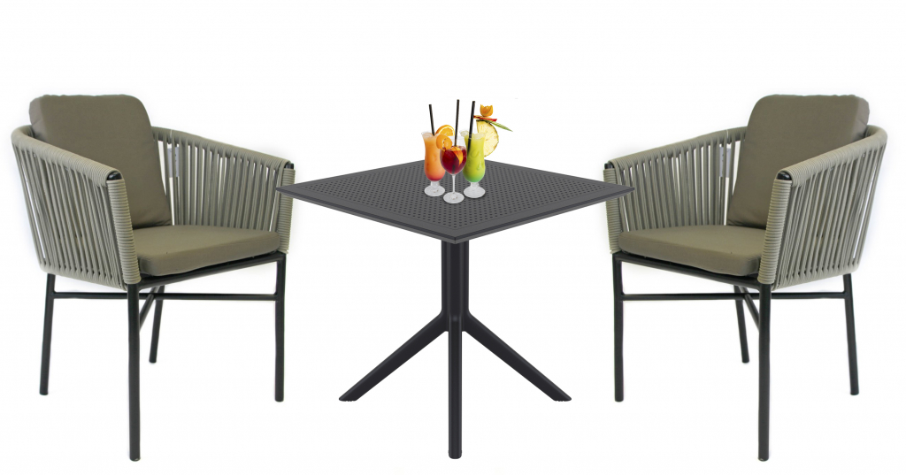 Комплект Sky Palermo состоит из квадратного стола и двух кресел. Квадратный пластиковый стол Sky со столешницей из погодостойкого пластика и каркасом из металла. Обеденное кресло Palermo привлекает внимание и, несомненно, украсит любое открытое пространство. личное кресло с эргономичным и современным дизайном с алюминиевым каркасом и спинкой в плетении из роупа. Комплект Sky Palermo подходит для открытой террасы бара, ресторана, отеля или небольшого частного зимнего сада. Состав комплекта: Кресло плетеное Palermo, размер: 580х600х760 мм - 2 шт. Стол пластиковый Sky, размер: 800х800х740 мм - 1 шт. Открыть инструкцию по уходу.Характеристики