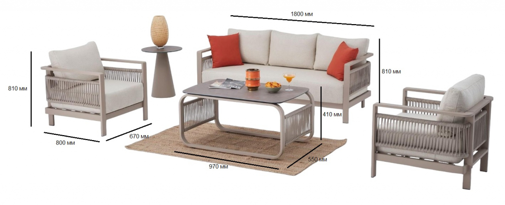 Комплект плетеной лаунж мебели Venedik – это идеальное решение для обустройства зоны отдыха как в сфере Contract, так и в частном проекте. Благодаря стильному внешнему виду и своим характеристикам комплект можно легко использовать в саду, на балконе или террасе. Благодаря алюминиевому каркасу мебель обладает прочностью и надежностью, а за счет плетения из акрила ее можно использовать на открытых пространствах, не боясь потери привлекательного внешнего вида, и с гарантированным сохранением цвета. Подушки на сиденьях дивана и кресел обеспечивают очень комфортную и удобную посадку. Состав комплекта: Кресло, размер 670х800х810 мм - 2 шт. Диван трехместный, размер 1800х800х810 мм - 1 шт. Столик кофейный, размер: 970х550х410 мм - 1 шт. Особенности: Каркас мебели выполнен из алюминия с электростатическим защитным порошковым покрытием, которое предотвращает коррозию и делает этот материал подходящим для наружного применения. Плетение выполнено из акрилового роупа. Чехлы подушек съемные, застежка на молнии, выполнены из олефина, подходящего для использования на открытом воздухе, водостойкого при любых погодных условиях, с гарантированной устойчивостью к выцветанию. Столешница кофейного столика изготовлена из керамики. Открыть инструкцию по уходу. Для уточнения всех возможных вариантов материала и цвета данного изделия обращайтесь к нашим менеджерам.Характеристики