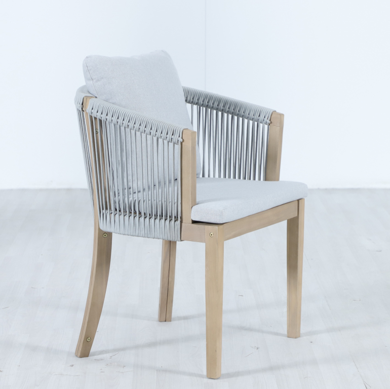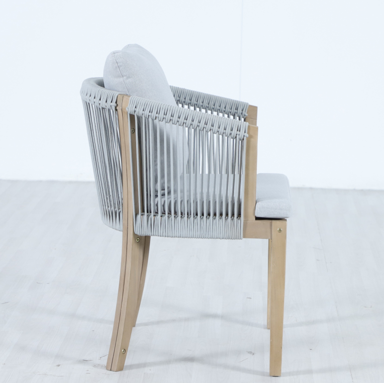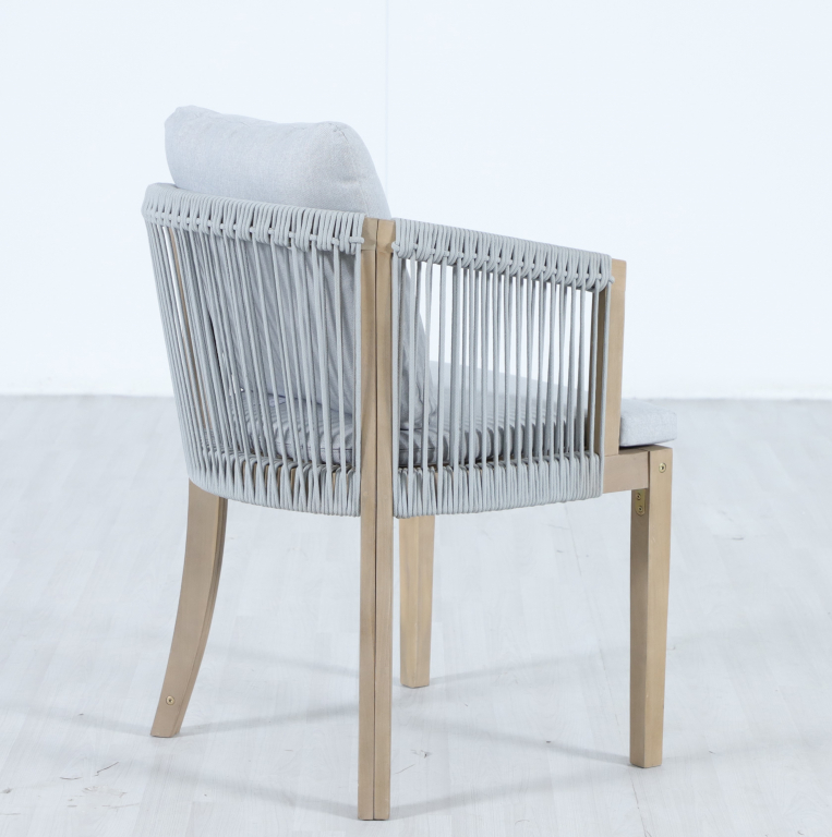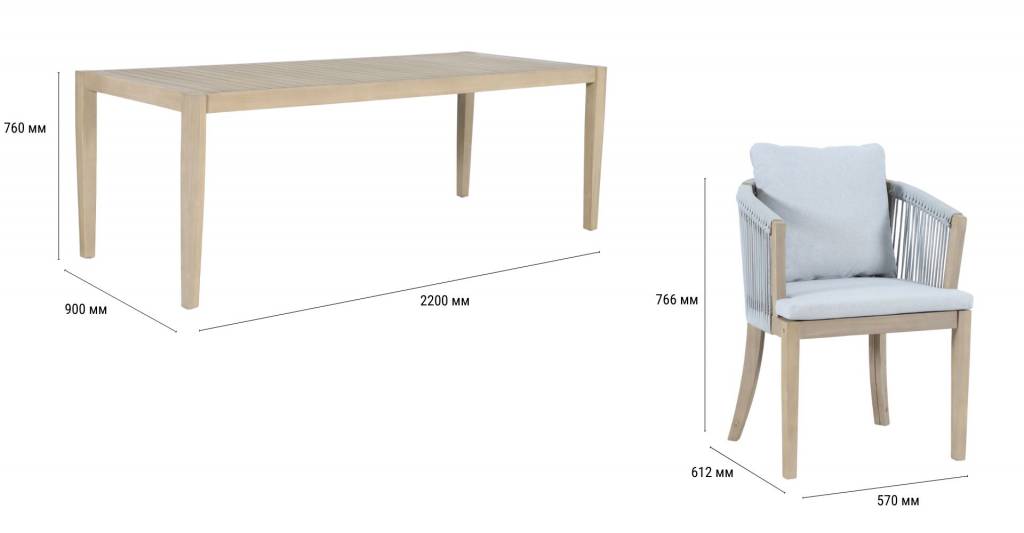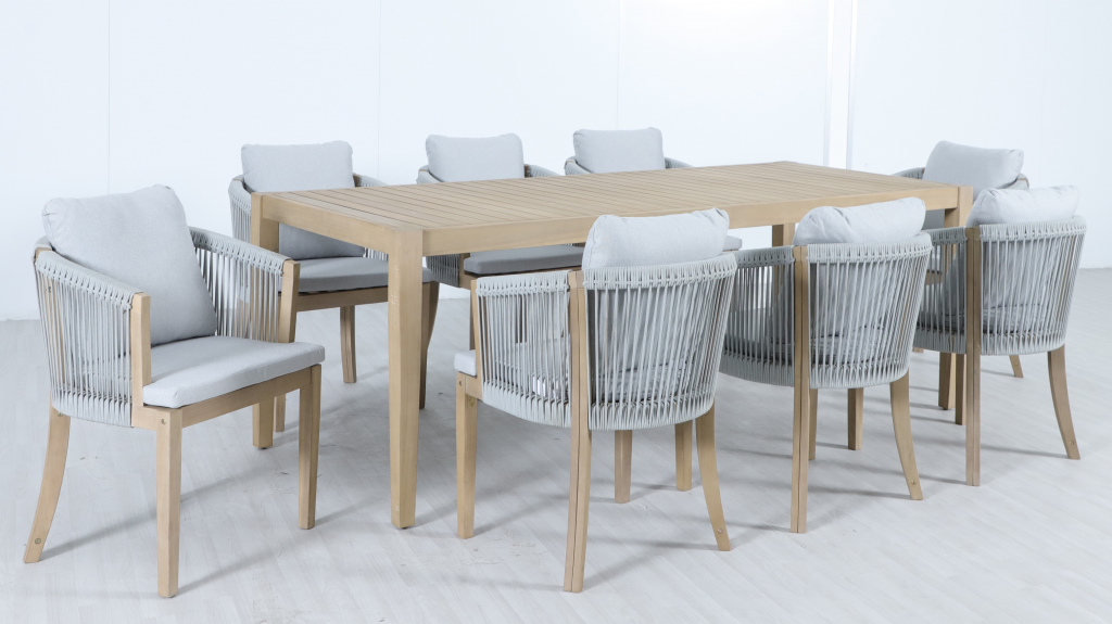 Обеденная группаVenetoна 8 персон - это линия уличной мебели из АКАЦИИ, объединяющая естественную теплоту дерева и стильные акценты из веревочного плетения роуп. Veneto создаёт цельную атмосферу на террасе, веранде или в зоне у бассейна. Концепция коллекции - эстетика природных материалов, продуманная эргономика и долговечность в условиях открытого воздуха. Особенности: Материал - АКАЦИЯ, отделка экомаслом тик Light #01A. Веревочное плетение роупVPR PR325 толщиной 6 ммна спинке и подлокотниках излучает стиль в сочетании с деревянными поверхностями. Древесина, из которой изготовлена мебель, имеет сертификацию FSC (Forest Stewardship Council) - гарантия качества и происхождения древесины. Знак FSC - показатель того, что продукция происходит из леса, в котором ведется экологически и социально ответственное лесное хозяйство. Благодаря своей долговечности, прочности и устойчивости к вредителям эта древесина была создана для изготовления садовой мебели. Страна происхождения древесины: Вьетнам, Малайзия. Средняя плотность древесины: 550 кг/м³. Столешница стола выполнена из массива акации. Анодированная фурнитура из нержавеющей стали. Подушки в комплекте, ткань подушек - олефин, наполнитель - толстый поролон. Материалы устойчивы к УФ-излучению и другим погодным воздействиям. Цвет подушек: светло-серый W1920-776 легко сочетается с любыми ландшафтными решениями. Состав комплекта: Кресло, размер: 570х612х766 мм - 8шт. Обеденный стол, размер: 2200х900х760- 1 шт. Данные упаковки: Кресло: Вес нетто: 17.48кг.Вес брутто: 23кг. Размер упаковки: 530х810х680 мм. Объем упаковки: 0.146 м³. Количество в упаковке: 2шт. Кресло: Вес нетто: 17.48кг.Вес брутто: 23кг. Размер упаковки: 530х810х680 мм. Объем упаковки: 0.146 м³. Количество в упаковке: 2шт. Кресло: Вес нетто: 17.48кг.Вес брутто: 23кг. Размер упаковки: 530х810х680 мм. Объем упаковки: 0.146 м³. Количество в упаковке: 2шт. Кресло: Вес нетто: 17.48кг.Вес брутто: 23кг. Размер упаковки: 530х810х680 мм. Объем упаковки: 0.146 м³. Количество в упаковке: 2шт. Обеденный стол:Вес нетто: 33.9кг.Вес брутто: 39.5кг. Размер упаковки: 2230х930х115мм. Объем упаковки: 0.238 м³. Количество в упаковке: 1шт. Открыть инструкцию по уходу. Вся деревянная мебель должна обрабатываться специальным маслом или пропиткой минимум 1 раз в 6 месяцев (в условиях высокой влажности обработку следует проводить чаще). Для данной мебели не рекомендуются резкие температурные перепады. Дерево является натуральным материалом, поэтому любые трещины, неравномерные природные рисунки, различность оттенков ‐ являются естественным процессом, который вызван температурными изменениями или влажностью.Характеристики