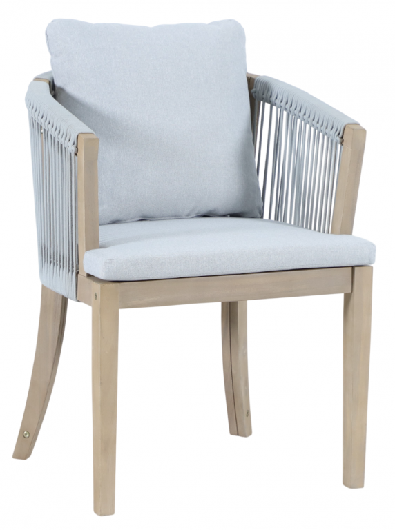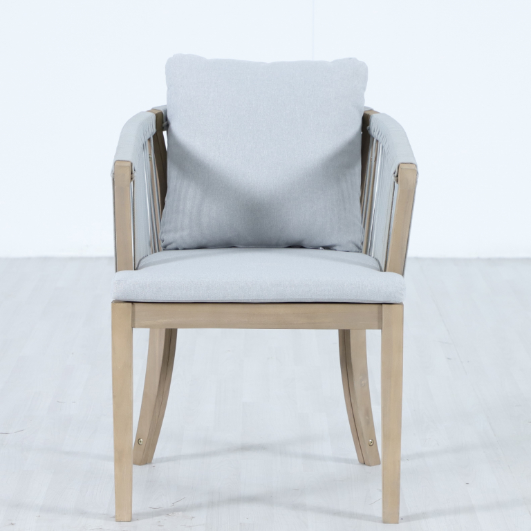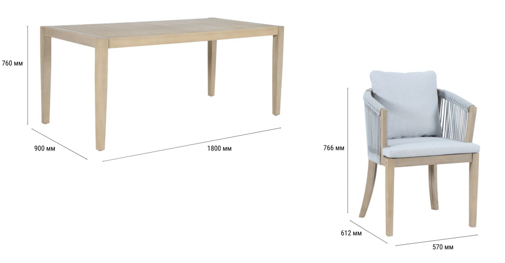 Обеденная группаVenetoна 6персон - это линия уличной мебели из АКАЦИИ, объединяющая естественную теплоту дерева и стильные акценты из веревочного плетения роуп. Veneto создаёт цельную атмосферу на террасе, веранде или в зоне у бассейна. Концепция коллекции - эстетика природных материалов, продуманная эргономика и долговечность в условиях открытого воздуха. Особенности: Материал - АКАЦИЯ, отделка экомаслом тик Light #01A. Веревочное плетение роупVPR PR325 толщиной 6 ммна спинке и подлокотниках излучает стиль в сочетании с деревянными поверхностями. Древесина, из которой изготовлена мебель, имеет сертификацию FSC (Forest Stewardship Council) - гарантия качества и происхождения древесины. Знак FSC - показатель того, что продукция происходит из леса, в котором ведется экологически и социально ответственное лесное хозяйство. Благодаря своей долговечности, прочности и устойчивости к вредителям эта древесина была создана для изготовления садовой мебели. Страна происхождения древесины: Вьетнам, Малайзия. Средняя плотность древесины: 550 кг/м³. Столешница стола выполнена из массива акации. Анодированная фурнитура из нержавеющей стали. Подушки в комплекте, ткань подушек - олефин, наполнитель - толстый поролон. Материалы устойчивы к УФ-излучению и другим погодным воздействиям. Цвет подушек - светло-серый W1920-776 легко сочетается с любыми ландшафтными решениями. Состав комплекта: Кресло, размер: 570х612х766 мм - 6шт. Обеденный стол, размер: 1800х900х760- 1 шт. Данные упаковки: Кресло: Вес нетто: 17.48кг.Вес брутто: 23кг. Размер упаковки: 530х810х680 мм. Объем упаковки: 0.146 м³. Количество в упаковке: 2шт. Кресло: Вес нетто: 17.48кг.Вес брутто: 23кг. Размер упаковки: 530х810х680 мм. Объем упаковки: 0.146 м³. Количество в упаковке: 2шт. Кресло: Вес нетто: 17.48кг.Вес брутто: 23кг. Размер упаковки: 530х810х680 мм. Объем упаковки: 0.146 м³. Количество в упаковке: 2шт. Обеденный стол:Вес нетто: 27.7кг.Вес брутто: 32.5кг. Размер упаковки: 1830х930х115мм. Объем упаковки: 0.196 м³. Количество в упаковке: 1шт. Открыть инструкцию по уходу. Вся деревянная мебель должна обрабатываться специальным маслом или пропиткой минимум 1 раз в 6 месяцев (в условиях высокой влажности обработку следует проводить чаще). Для данной мебели не рекомендуются резкие температурные перепады. Дерево является натуральным материалом, поэтому любые трещины, неравномерные природные рисунки, различность оттенков ‐ являются естественным процессом, который вызван температурными изменениями или влажностью.Характеристики