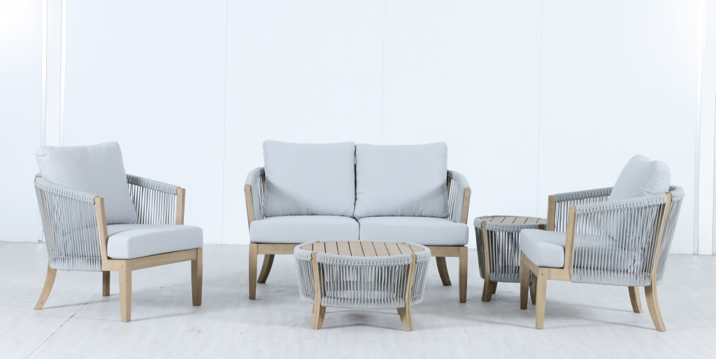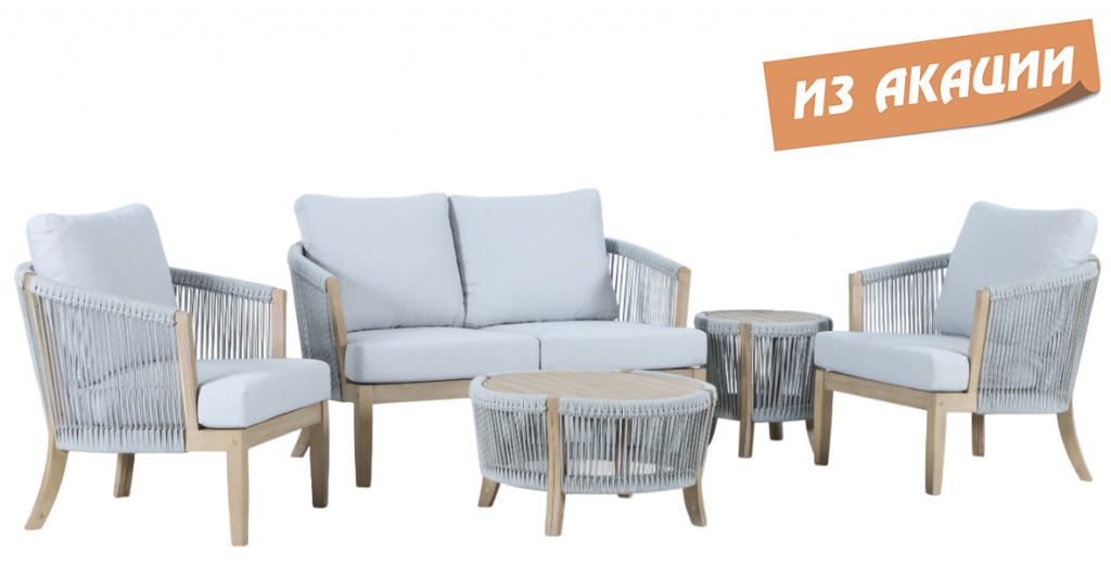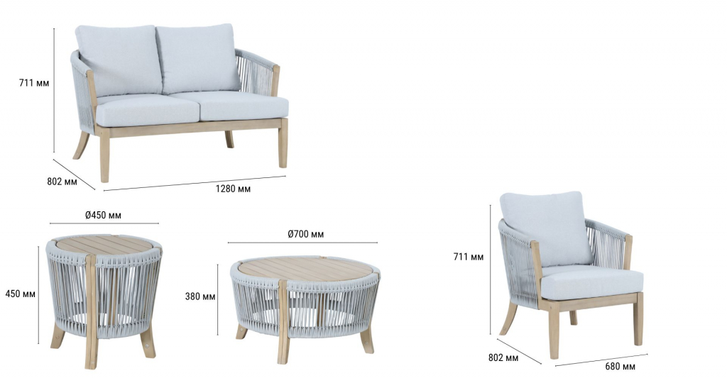 Коллекция Veneto - это линия уличной мебели из АКАЦИИ, объединяющая естественную теплоту дерева и стильные акценты из веревочного плетения роуп.Комплект для отдыха состоит из двухместного дивана, двух комфортных кресел и двух журнальныхстоликов. Veneto создаёт цельную атмосферу на террасе, веранде или в зоне у бассейна. Концепция коллекции - эстетика природных материалов, продуманная эргономика и долговечность в условиях открытого воздуха. Особенности: Материал - АКАЦИЯ, отделка экомаслом тик Light #01A. Веревочное плетение роупVPR PR325 толщиной 6 ммна спинке и подлокотниках излучает стиль в сочетании с деревянными поверхностями. Древесина, из которой изготовлена мебель, имеет сертификацию FSC (Forest Stewardship Council) - гарантия качества и происхождения древесины. Знак FSC - показатель того, что продукция происходит из леса, в котором ведется экологически и социально ответственное лесное хозяйство. Благодаря своей долговечности, прочности и устойчивости к вредителям эта древесина была создана для изготовления садовой мебели. Страна происхождения древесины: Вьетнам, Малайзия. Средняя плотность древесины: 550 кг/м³. Столешница стола выполнена из массива акации. Анодированная фурнитура из нержавеющей стали. Подушки в комплекте, ткань подушек - олефин, наполнитель - толстый поролон. Материалы устойчивы к УФ-излучению и другим погодным воздействиям. Цвет подушек: светло-серый W1920-776 легко сочетается с любыми ландшафтными решениями. Состав комплекта: Кресло лаунж с подушками, размер: 680х802х711мм - 2шт. Диван двухместный с подушками, размер: 1280х802х711мм - 1шт. Столик кофейный,размер: Ø700х380мм - 1 шт. Столик кофейный,размер: Ø450х450мм - 1 шт. Данные упаковки: Кресло лаунж: Вес нетто: 25.48 кг.Вес брутто: 34кг. Размер упаковки: 750х780х1070 мм. Объем упаковки: 0.313 м³. Количество в упаковке: 2шт. Диван двухместный: Вес нетто: 20.44 кг.Вес брутто: 28 кг. Размер упаковки: 1250х780х650 мм. Объем упаковки: 0.634 м³. Количество в упаковке: 1шт. Столик кофейный: Вес нетто: 9.08 кг.Вес брутто: 13кг. Размер упаковки: 665х665х400 мм. Объем упаковки: 0.177 м³. Количество в упаковке: 1 шт. Столик кофейный: Вес нетто: 5.74 кг.Вес брутто: 11.5кг. Размер упаковки: 520х435х340мм. Объем упаковки: 0.077 м³. Количество в упаковке: 1 шт. Открыть инструкцию по уходу. Вся деревянная мебель должна обрабатываться специальным маслом или пропиткой минимум 1 раз в 6 месяцев (в условиях высокой влажности обработку следует проводить чаще). Для данной мебели не рекомендуются резкие температурные перепады. Дерево является натуральным материалом, поэтому любые трещины, неравномерные природные рисунки, различность оттенков ‐ являются естественным процессом, который вызван температурными изменениями или влажностью.Характеристики