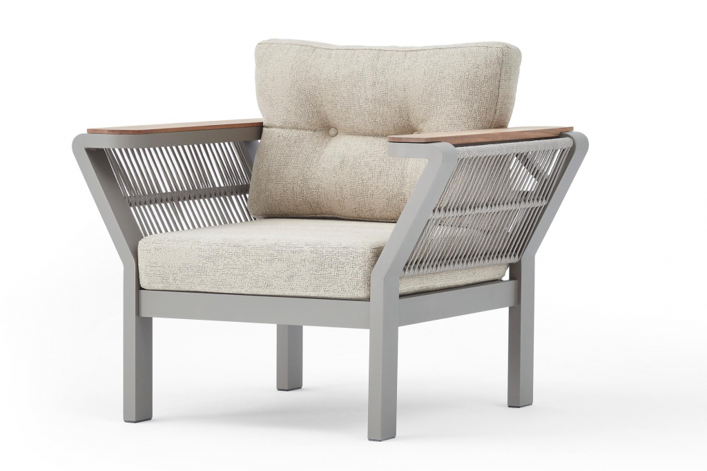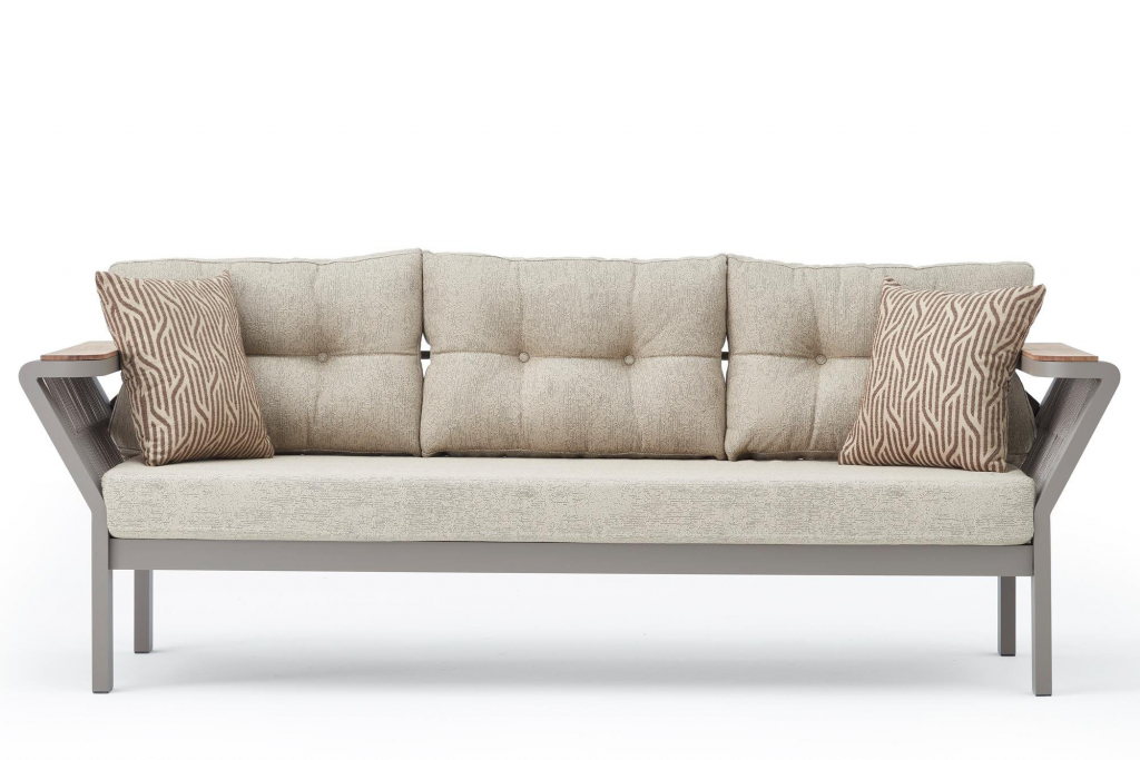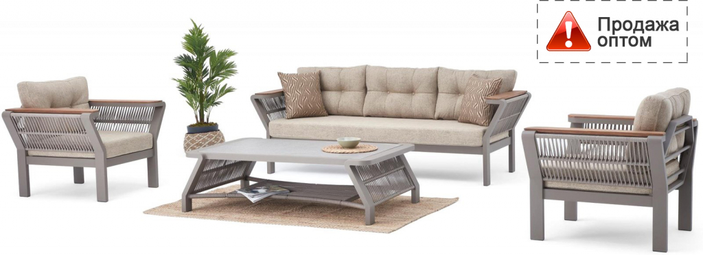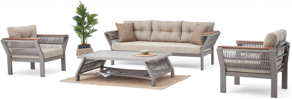 Красивый уличный комплект мебели для отдыха Vicenza, включающий трехместный диван, два кресла и кофейный прямоугольный столик, идеально подходит для использования на террасах отелей, ресторанов и кафе, а также в частных домах, где важно создать уютную зону для отдыха. Его алюминиевый каркас обеспечивает прочность и долговечность, а плетение из роупа придает мебели стильный вид, подчеркивая ее современный дизайн. Столешница кофейного столика из керамики обеспечивает устойчивость к влаге и механическим повреждениям. Подлокотники дивана и кресел из дерева ироко придают комплекту естественную красоту и природный комфорт. Подушки со съемными чехлами из олефина не только добавляют уюта и мягкости, но и легко могут быть чистыми и ухоженными в любое время. Такой комплект мебели станет привлекательным и функциональным решением для обустройства открытых пространств любого заведения или дома. Состав комплекта: Кресло, размер 950х800х830 мм - 2 шт. Диван трехместный, размер 2270х800х830 мм - 1 шт. Столик кофейный, размер: 1350х850х410 мм - 1 шт. Особенности: Каркас мебели выполнен из алюминия с электростатическим защитным порошковым покрытием, которое предотвращает коррозию и делает этот материал подходящим для наружного применения. Плетение выполнено из акрилового роупа. Подлокотники дивана и кресел выполнены из ироко. Древесина ироко отличается очень высокой прочностью, твердостью и сопротивлением нагрузкам, практически не подвержена воздействию различного рода вредителей. Чехлы подушек съемные, застежка на молнии, выполнены из олефина, подходящего для использования на открытом воздухе, водостойкого при любых погодных условиях, с гарантированной устойчивостью к выцветанию. Столешница кофейного столика изготовлена из керамики. Открыть инструкцию по уходу. Для уточнения всех возможных вариантов материала и цвета данного изделия обращайтесь к нашим менеджерам.Характеристики