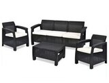 Данная садовая мебель изготовлена по бескаркасной технологии из пластика, композитных материалов с имитацией искусственного ротанга. Данная мебель не имеет плетения как такового, но технология изготовления позволяет практически на 100% ее имитировать. В отличие от плетеной мебели (из искусственного ротанга) эта не расплетается и не шелушится, а благодаря тому что это цельный пластик - она не имеет каркаса, а значит гораздо легче своих аналогов и, при этом, не теряет в прочности и надежности. Аналог искусственного ротанга уже завоевал рынок всего Мира и активно набирает обороты в России. Данная мебель находит применение на балконах, на открытых террасах, в отелях и загородных домах отдыха, в SPA-комплексах, в летних кафе и ресторанах, на пляжах и зонах отдыха, что обусловлено целым рядом положительных качеств данной мебели Особенности: • Стильный, современный внешний вид. • 100% имитация искусственного ротанга. • Высокопрочный и долговечный пластик. • Не боятся дождя, снега и разрушающих солнечных лучей. • Выдерживают высокую нагрузку. • Простой уход - моются обычной водой. • Важной особенностью отличающей данную мебель от плетеной является то, что она не расплетается, не вытягивается лоза в местах сидения, а также небольшой вес. Характеристики: Трехместная софа, два кресла и кофейный стол. Темно-коричневый цвет, подушки серые. Диван: 182х70х79 см. Кресло: 75х70х79 см. Стол: 77х57х42 см. Упаковка: 182х77х55 см. Материал: пластик.