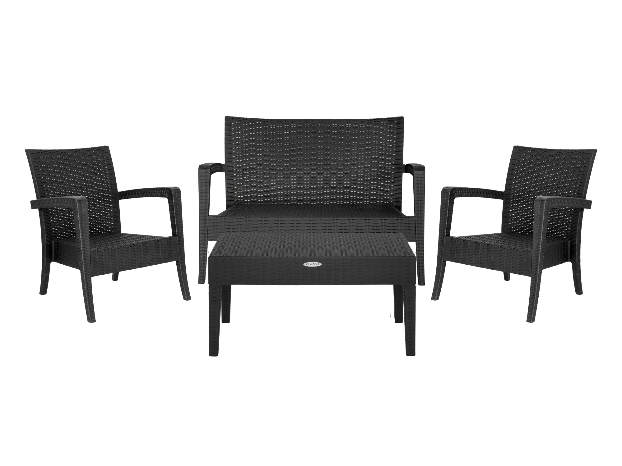 Габариты элементов (Ш/ГхДхВ) : столик: 92х53х45 кресло-диван: 76х72х89 диван: 128х77х89 Цвет каркаса : антрацит Материал каркаса : полипропилен с добавлением стекловолокна Цвет поверхности : антрацит Материал поверхности : пластик Комплектация : стол, 2 стула, диван Страна производства : РОССИЯХарактеристики