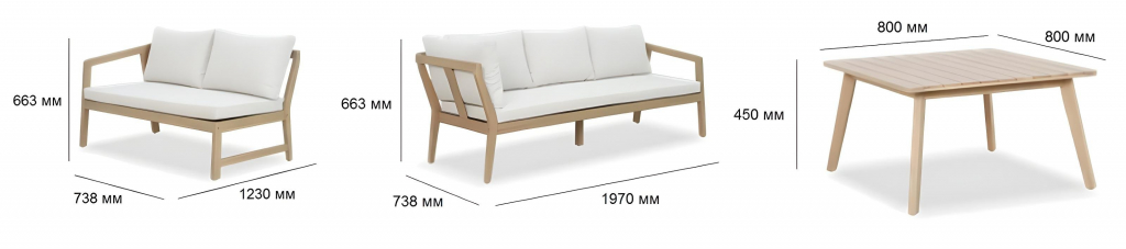 Коллекция Nara представляет собой идеальное сочетание современного дизайна и утончённой элегантности, созданное для оформления вашего сада. Гармония натуральной древесины акации с мягкими бежевыми подушками создаёт атмосферу уюта и изысканности в любом открытом пространстве. Комплект включает вместительные двух- и трёхместные модули, а также элегантный кофейный столик - идеально сбалансированное решение для комфортного отдыха на свежем воздухе. Прочный каркас из натуральной древесины гарантирует долговечность и устойчивость конструкции, а стильное исполнение подчёркивает утончённый вкус и статус владельца. Коллекция Nara - это синоним комфорта, современного стиля и природной эстетики, которые украсят вашу террасу или веранду. Состав комплекта: Модуль трехместный с подушками, размер 1970х738х663 мм - 1 шт. Модуль двухместный с подушками, размер 1230х738х663 мм - 1 шт. Столик кофейный, размер: 800х800х450 мм - 1 шт. Особенности: Материал - АКАЦИЯ, отделка Rose Grey. Древесина, из которой изготовлена мебель, имеет сертификацию FSC (Forest Stewardship Council) - гарантия качества и происхождения древесины. Знак FSC - показатель того, что продукция происходит из леса, в котором ведется экологически и социально ответственное лесное хозяйство. Благодаря своей долговечности, прочности и устойчивости к вредителям эта древесина была создана для изготовления садовой мебели. Страна происхождения древесины: Вьетнам, Малайзия. Средняя плотность древесины: 550 кг/м3. Подушки в комплекте. Цвет подушек - льняной бежевый. Материалы устойчивы к УФ-излучению и другим погодным воздействиям. Открыть инструкцию по уходу. Вся деревянная мебель должна обрабатываться специальным маслом или пропиткой минимум 1 раз в 6 месяцев (в условиях высокой влажности обработку следует проводить чаще). Для данной мебели не рекомендуются резкие температурные перепады. Мебель из дерева акации должна использоваться только под навесом. Дерево является натуральным материалом, поэтому любые трещины, неравномерные природные рисунки, различность оттенков ‐ являются естественным процессом, который вызван температурными изменениями или влажностью. Для уточнения всех возможных вариантов материала и цвета данного изделия обращайтесь к нашим менеджерам.Характеристики