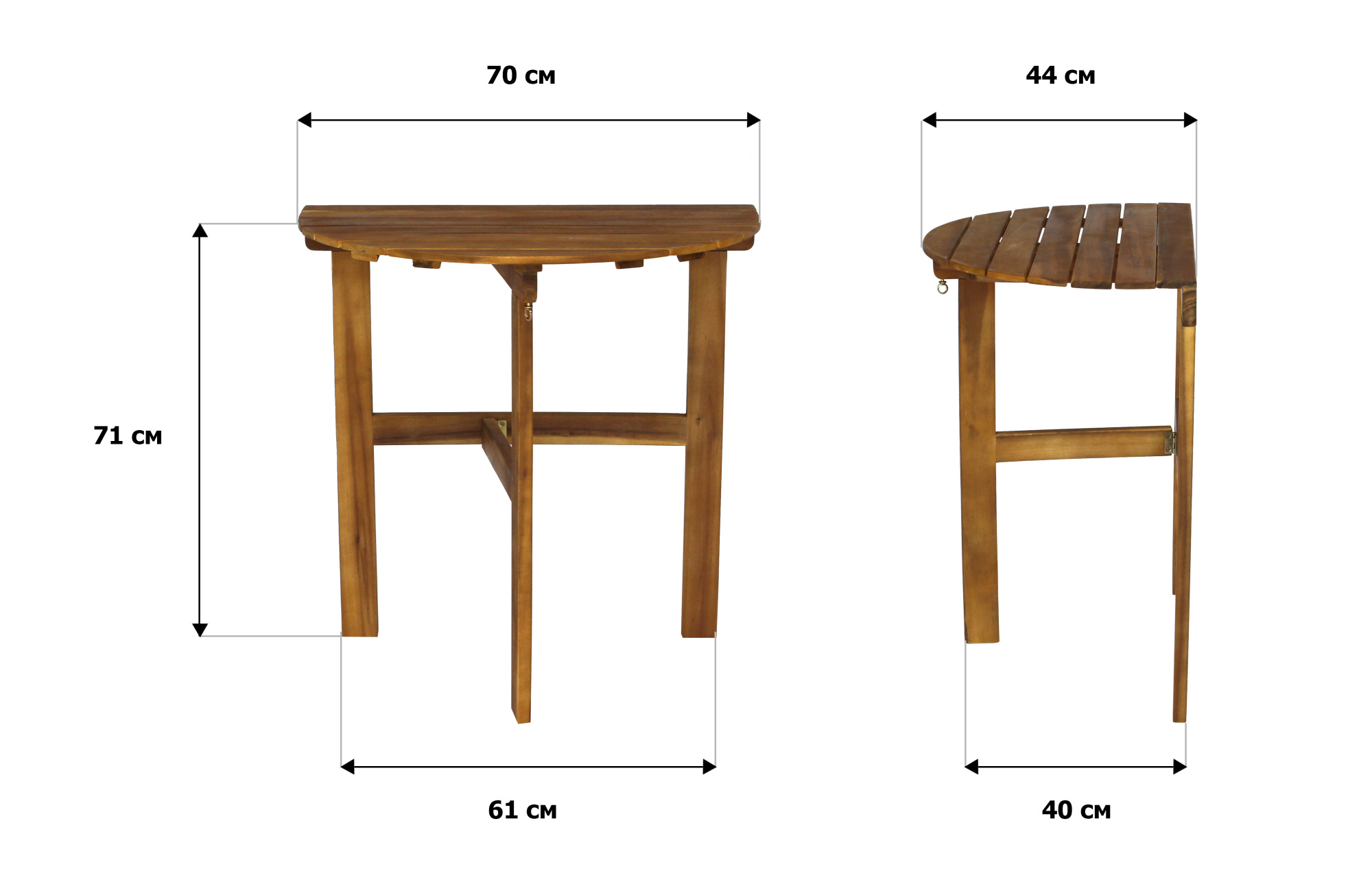 Габариты элементов (Ш/ГхДхВ) : Стол: 44x70x71 Стул: 42х51х82, стул: 42х50х83 Цвет каркаса : акация цвет дерева Материал каркаса : дерево (акация) Цвет чехла мягкого элемента/матраса : нет Узор ткани : нет Цвет поверхности : акация цвет дерева Материал поверхности : дерево (акация), искуственный ротанг Комплектация : стол, 2 стула Использование на открытом воздухе : да Страна производства : ВЬЕТНАМ Дополнительно : Особенности модели- складная, нагузка на стол 30 кг., высота столешницы 12 ммХарактеристики