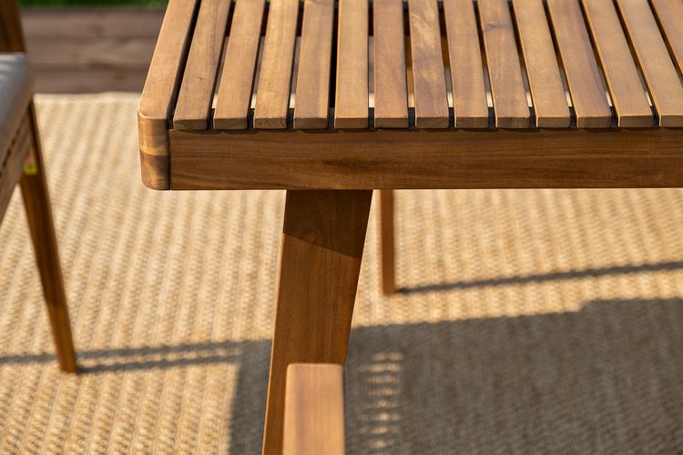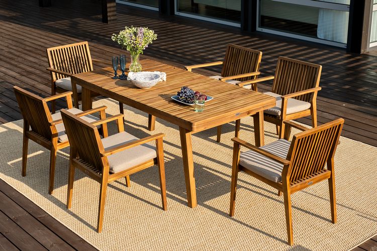 МОНА – современная коллекция садовой мебели из акации в скандинавском стиле в комбинации массива акации и бежевых подушек.