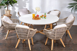 Расширенная версия безусловного хита сезона, созданная для тех, кто ценит индивидуальность и простор. Обеденная группа ТАЛАРА M объединяет вместительный круглый стол с эффектной столешницей из керамогранита и шесть изящных кресел с веревочным плетением, создавая композицию в легких пастельных тонах, которая станет главным художественным акцентом вашей террасы или сада.