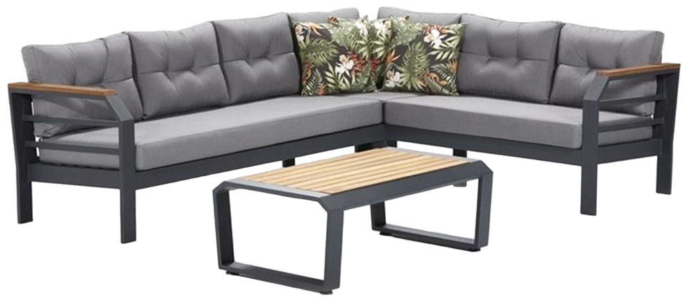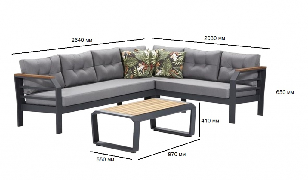 Уличный угловой комплект Assento представляет собой идеальное решение для создания комфортной зоны отдыха на открытых пространствах. Включает в себя угловой 5-местный диван и стильный кофейный столик, обеспечивая удобство и функциональность для отелей, ресторанов, кафе и домашнего использования. Каркас мебели изготовлен из алюминия, обеспечивающего прочность и долговечность в условиях эксплуатации на улице. Подушки со съемными чехлами из олефина добавляют мягкости и комфорта, а столешница столика из ироко придает комплекту естественную красоту и надежность. Уличный комплект мебели Assento станет привлекательным и практичным дополнением к любому окружению, где гости смогут наслаждаться отдыхом под открытым небом в уютной обстановке. Состав комплекта: Диван 5-местный, размер 2640х2030х650 мм - 1 шт. Столик кофейный, размер: 970х550х410 мм - 1 шт. Особенности: Каркас мебели выполнен из алюминия с электростатическим защитным порошковым покрытием, которое предотвращает коррозию и делает этот материал подходящим для наружного применения. Столешница кофейного столика и подлокотники дивана выполнены из ироко. Древесина ироко отличается очень высокой прочностью, твердостью и сопротивлением нагрузкам, практически не подвержена воздействию различного рода вредителей. Чехлы подушек съемные, застежка на молнии, выполнены из олефина, подходящего для использования на открытом воздухе, водостойкого при любых погодных условиях, с гарантированной устойчивостью к выцветанию. Открыть инструкцию по уходу. Для уточнения всех возможных вариантов материала и цвета данного изделия обращайтесь к нашим менеджерам.Характеристики