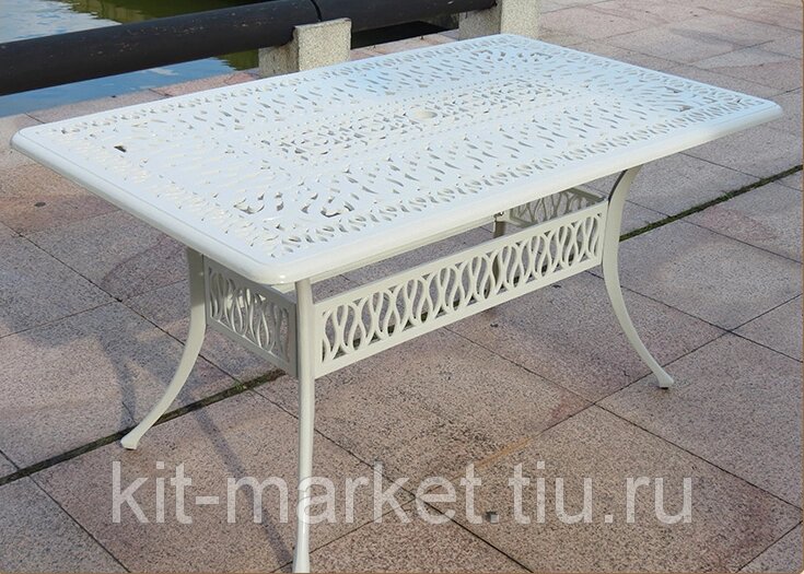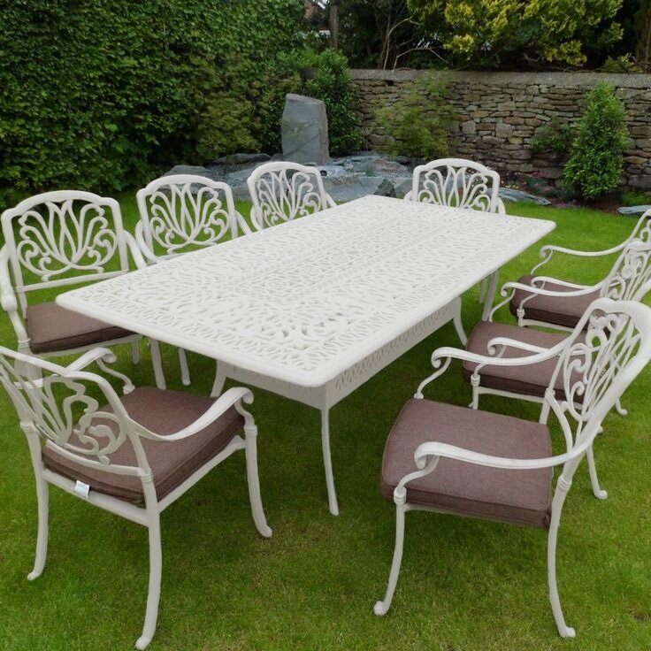 Обеденная группа из литого алюминия белого цвета с большим столом на 8 персон станет хитом садового дизайна, на террасе и в беседке она будет центром всеобщего внимания. Такая металлическая мебель из алюминия может эксплуатироваться в любое время года. Комплект состоит из прямоугольного стола и 8 кресел с бежевыми подушками.