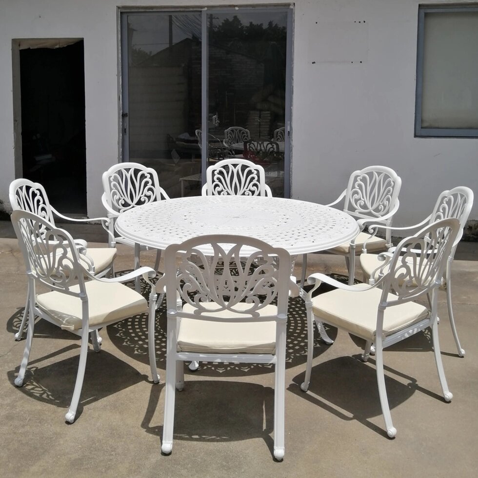 Белая обеденная группа Patty 8 из литого алюминия имеет большой круглый стол 150 см и рассчитан на компанию до 8 персон. Такая садовая мебель из металла будет отлично смотреться в загородном доме, на даче и садовом участке. Обеденный комплект состоит из круглого стола и 8 кресел с бежевыми подушками.