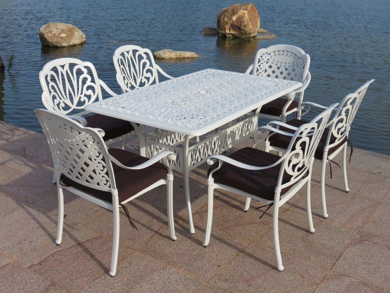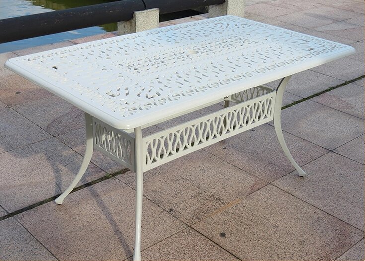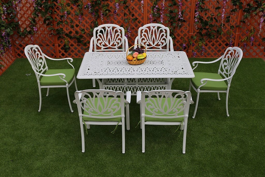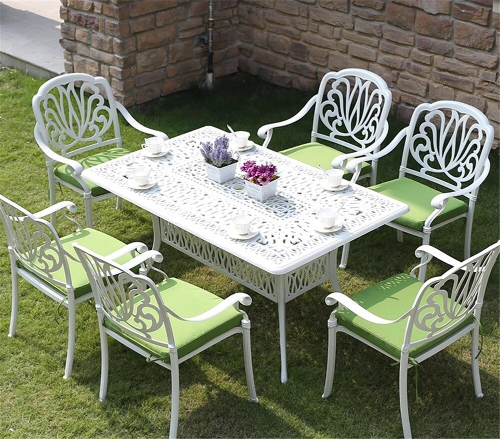 Белая обеденная группа из литого алюминия со столом на 6 персон станет изюминкой садового дизайна, на террасе и в беседке она станет центром всеобщего внимания. Такой металлической мебели не страшны ни дождь, ни снег. Литая группа мебели состоит из прямоугольного стола и 6 кресел с подушками.