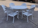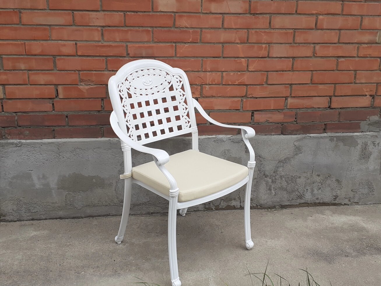 Белый обеденный комплект мебели из литого алюминия Vienna 6 будет прекрасно смотреться как в саду, так и на террасе или в загородном доме. Металлическая литая мебель из алюминия надежна, практична и долговечна, не требует особого ухода, хорошо справляется с капризами погоды. Набор состоит из круглого стола 120 см и 6 кресел с подушками.