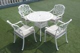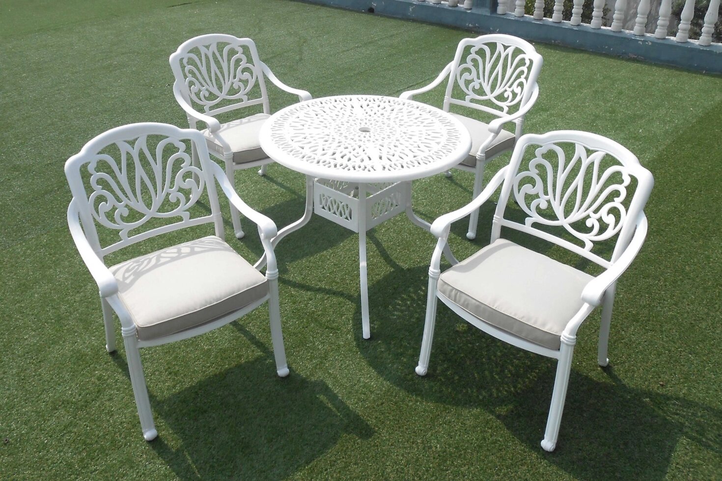 Белая обеденная группа Harold IV с круглым столом 91 см из литого алюминия рассчитана на 4 персоны. Данный комплект садовой мебели будет отлично смотреться как на веранде, так и террасе, и в загородном доме литая мебель из металла будет выглядеть очень привлекательно. Садовый комплект мебели состоит из стола и 4 кресел с бежевыми или серыми подушками.