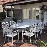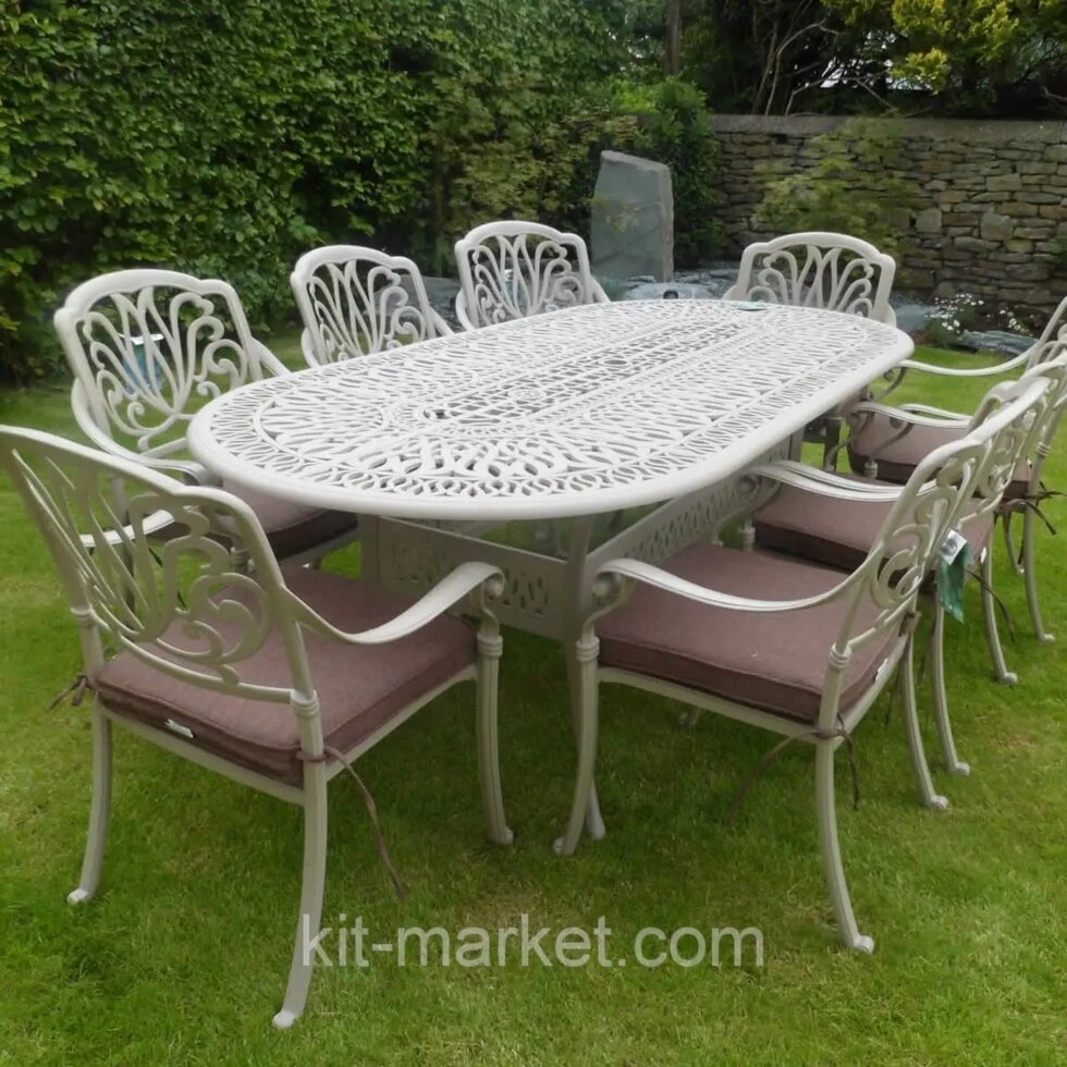 Белая столовая группа из литого алюминия Tokyo рассчитана на 8 персон, она будет очень стильно смотреться на террасе или в беседке. Эта садовая металлическая мебель легка и неприхотлива к погодным условиям в отличии от мебели из чугуна и кованой мебели, ей не страшны перепады температур и погодные осадки, может использоваться и под открытым небом. У стола из алюминия отсутствуют острые углы, что предотвращает от случайного травматизма. Комплект включает в себя овальный стол 220 см и 8 кресел с подушками.