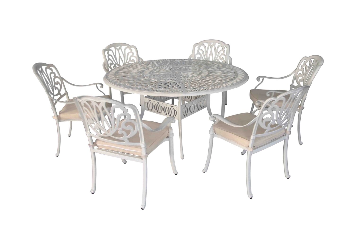 Белый обеденный комплект садовой металлической мебели William VI из литого алюминия очень вместительный, благодаря большому круглому столу диаметром 122 см, можно собрать за ним компанию до 6 человек. Металлический набор садовой мебели William VI состоит из круглого стола и 6 кресел со светло-бежевыми подушками
