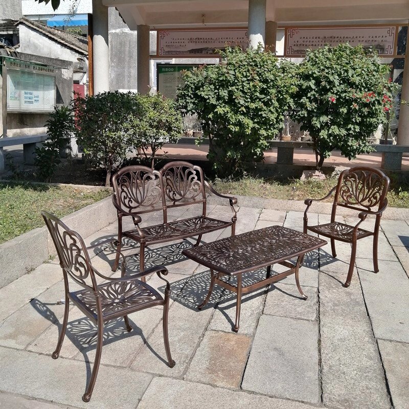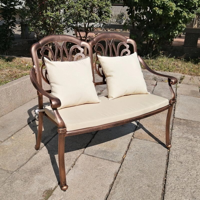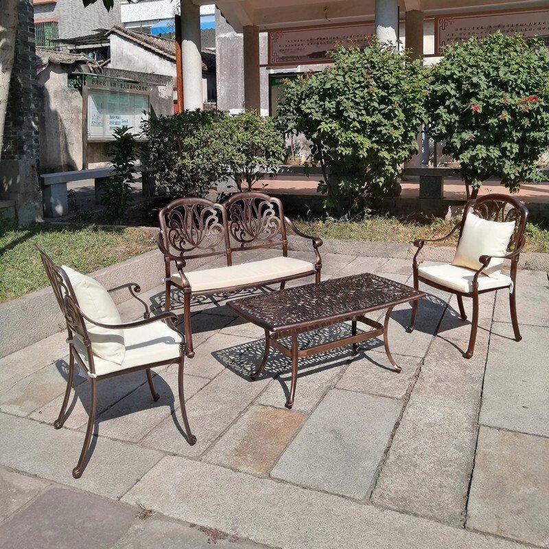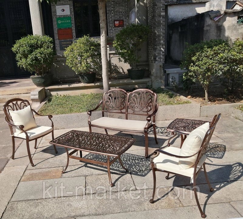 Комплект мебели для отдыха Valencia из литого алюминия будет уютно смотреться на террасе или садовом участке. Такая металлическая садовая мебель обладает всеми преимуществами кованной, но легче и не ржавеет. Комплект включает в себя из 2 кресла (ШхГхВ-60.5*64*93 см), диван на 2 персоны (112*62*93 см), журнальный стол (110*58*53 см), бежевые подушки в комплекте. Цвет: античная бронза (черный+бронза), белый.