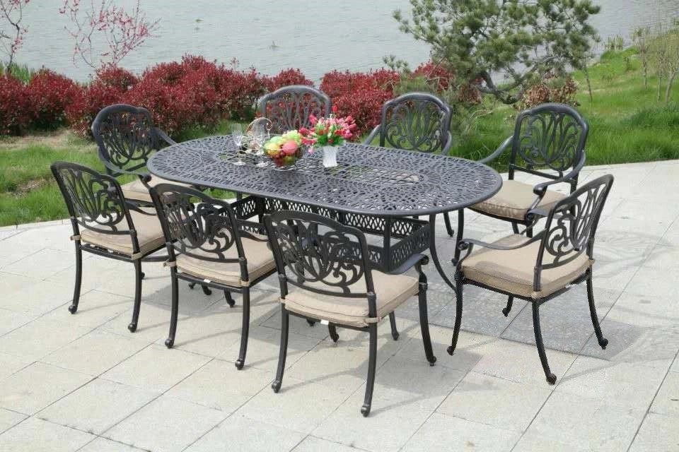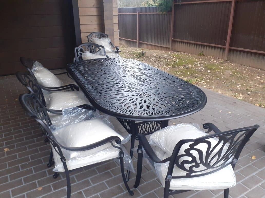 Обеденная группа из литого алюминия Alexander VIII с овальным столом на 8 персон будет шикарно смотреться как на открытой площадке, так и в доме. Литую мебель из алюминия можно поставить на веранду, террасу, в беседку. Металлический комплект включает в себя стол и 8 кресел со светло-бежевыми или серыми подушками.
