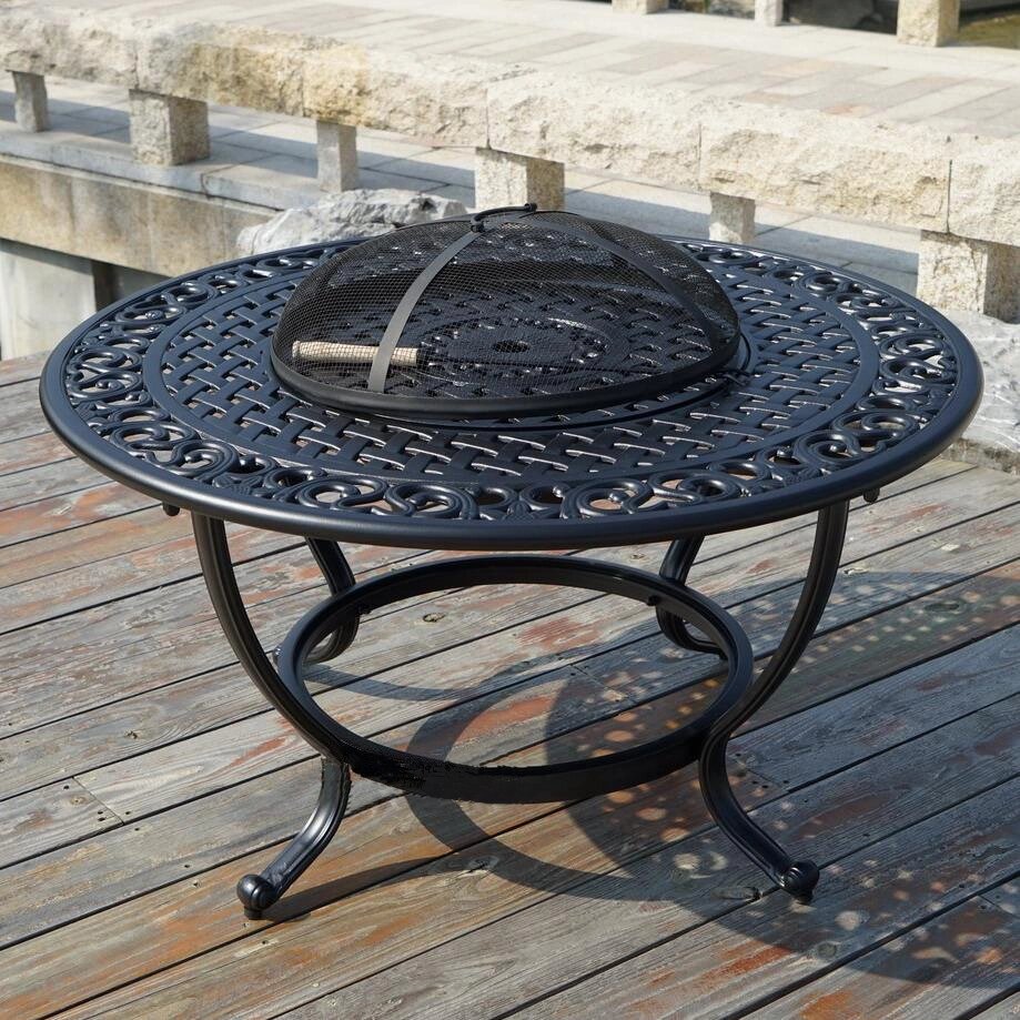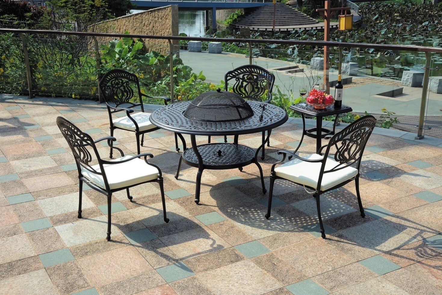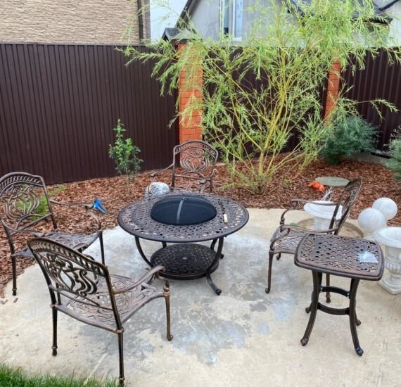 Особенностью данного комплекта металлической мебели из литого алюминия является стол-мангал. Купив такую садовую мебель, ваша компания самостоятельно может готовить мясо, рыбу, овощи не отходя от стола. Если вы не планируете делать гриль, то закрыв мангал специальным диском, можете продолжить отдыхать как за обычным столом. Набор из алюминия состоит из стола с мангалом, 4 кресел с подушками и кофейного столика.