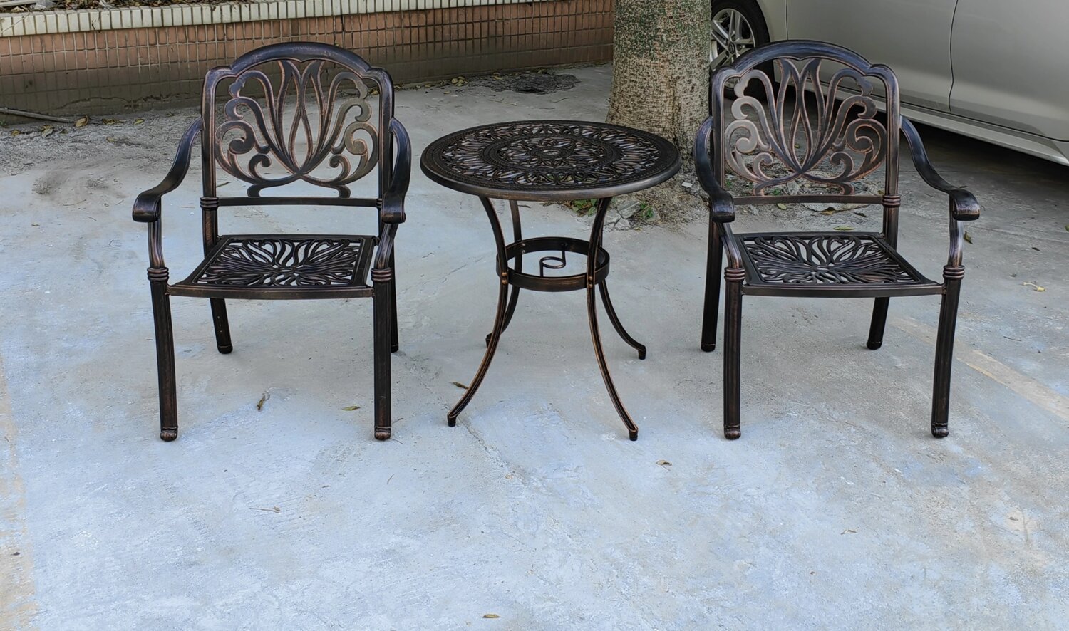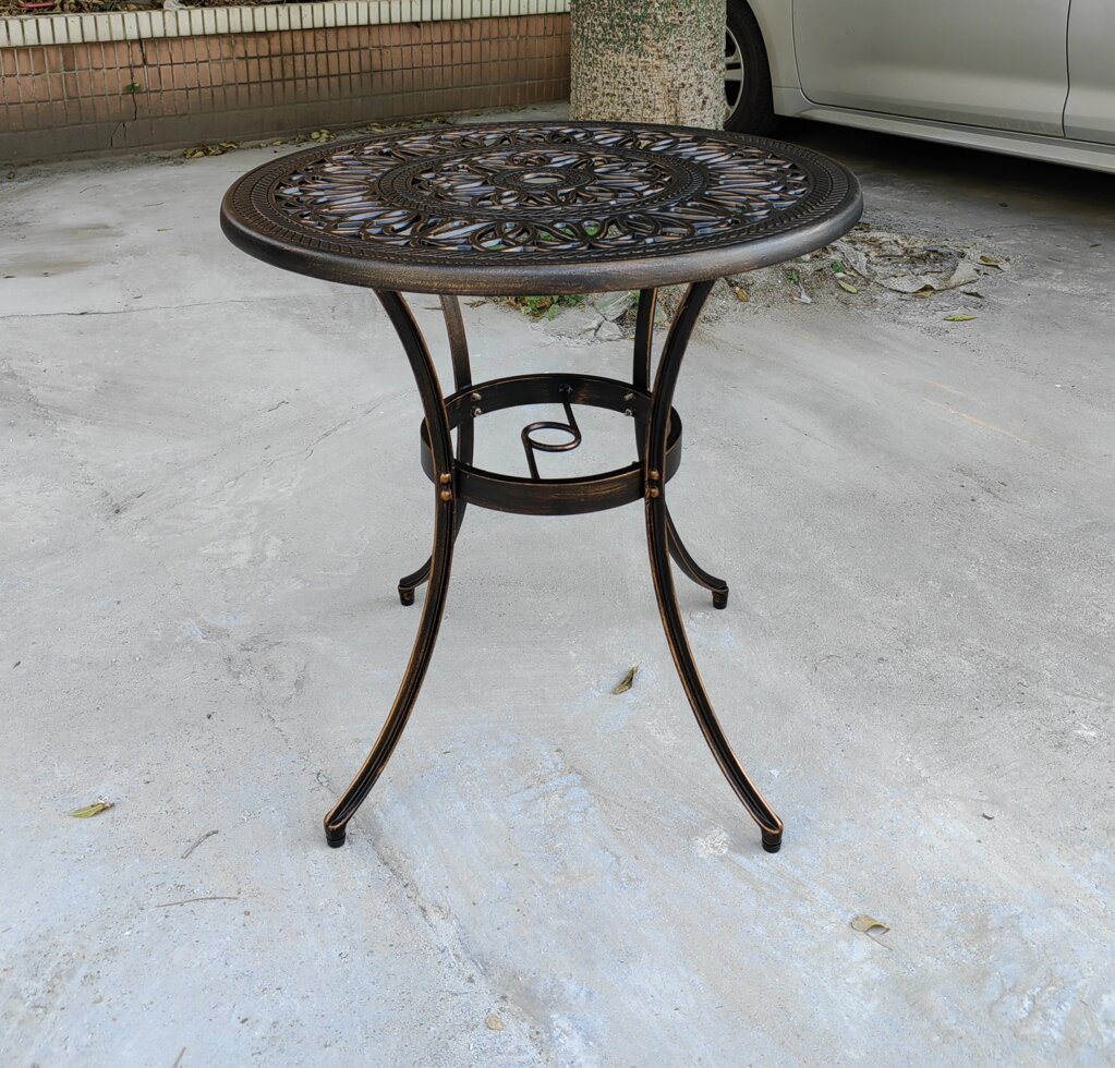 В садовый комплект мебели из алюминия Foshan 2 входит круглый стол диаметром 70 см и два кресла с бежевыми подушками. Данный алюминиевый комплект мебели легкий, не ржавеет и может разместиться как в доме, так и в саду или на балконе. Цвет: античная бронза.