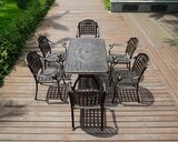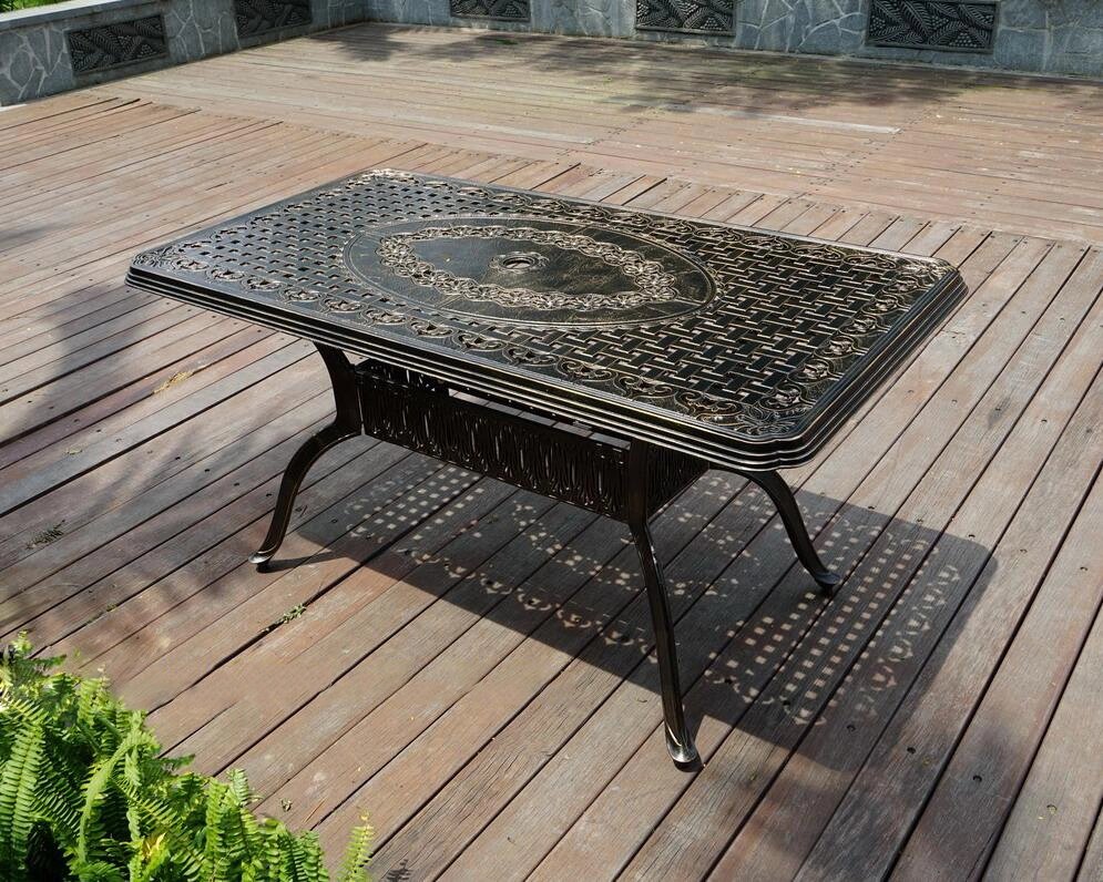 Обеденную группу мебели из литого алюминия Delhi 145 на 6 персон можно поставить как в доме, так и на террасе или в беседке. Этой металлической мебели не страшны перепады температур и погодные капризы,она может использоваться на улице. Комплект состоит из прямоугольного стола и 6 разборных кресел со светло-бежевыми подушками.