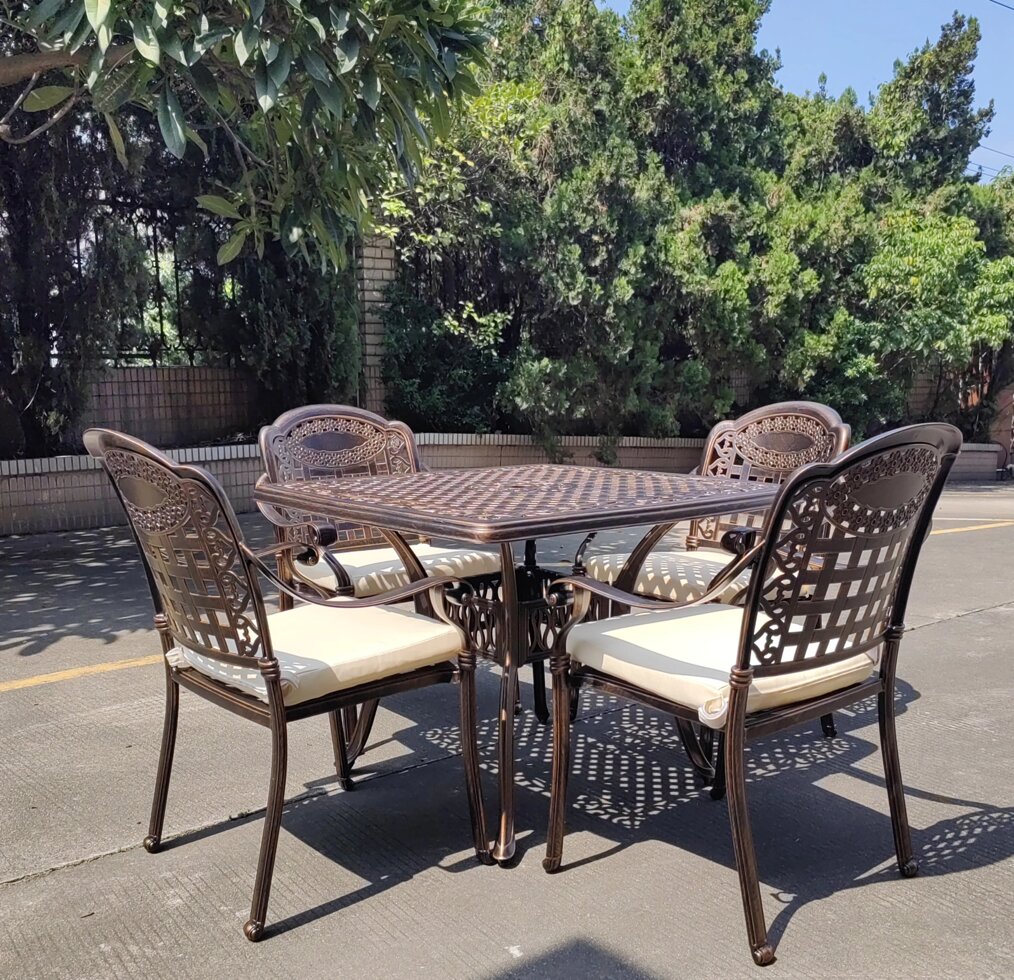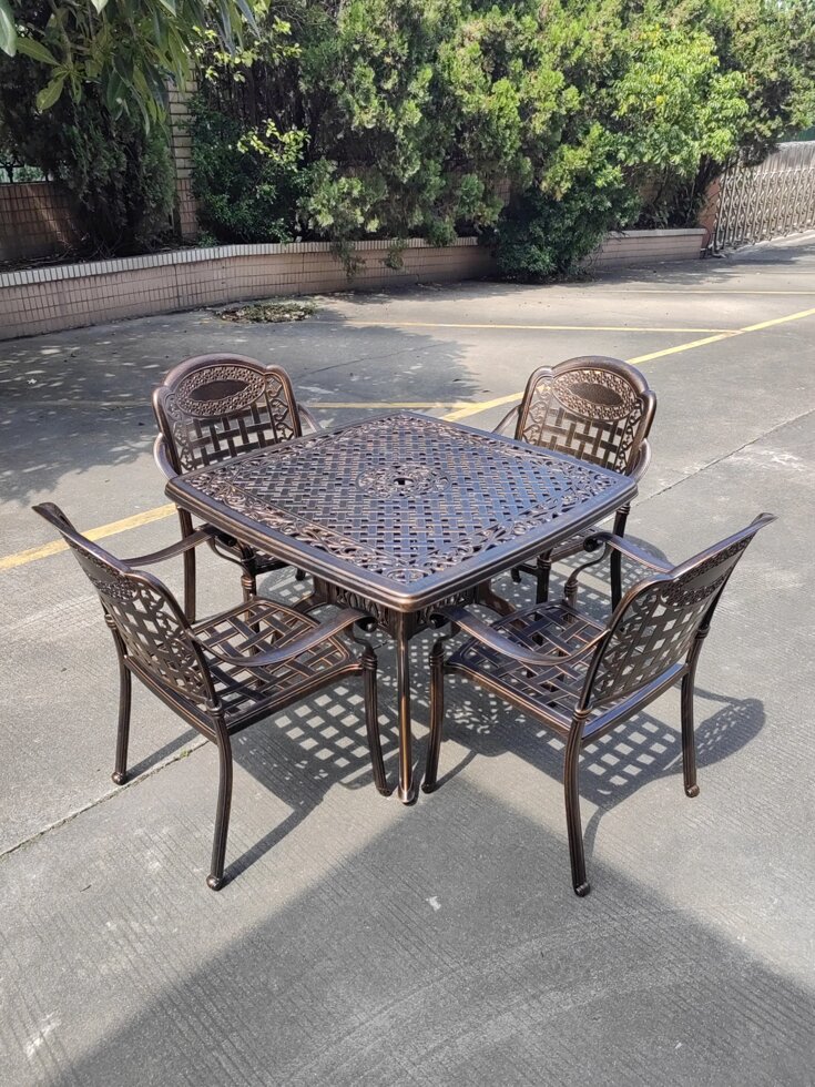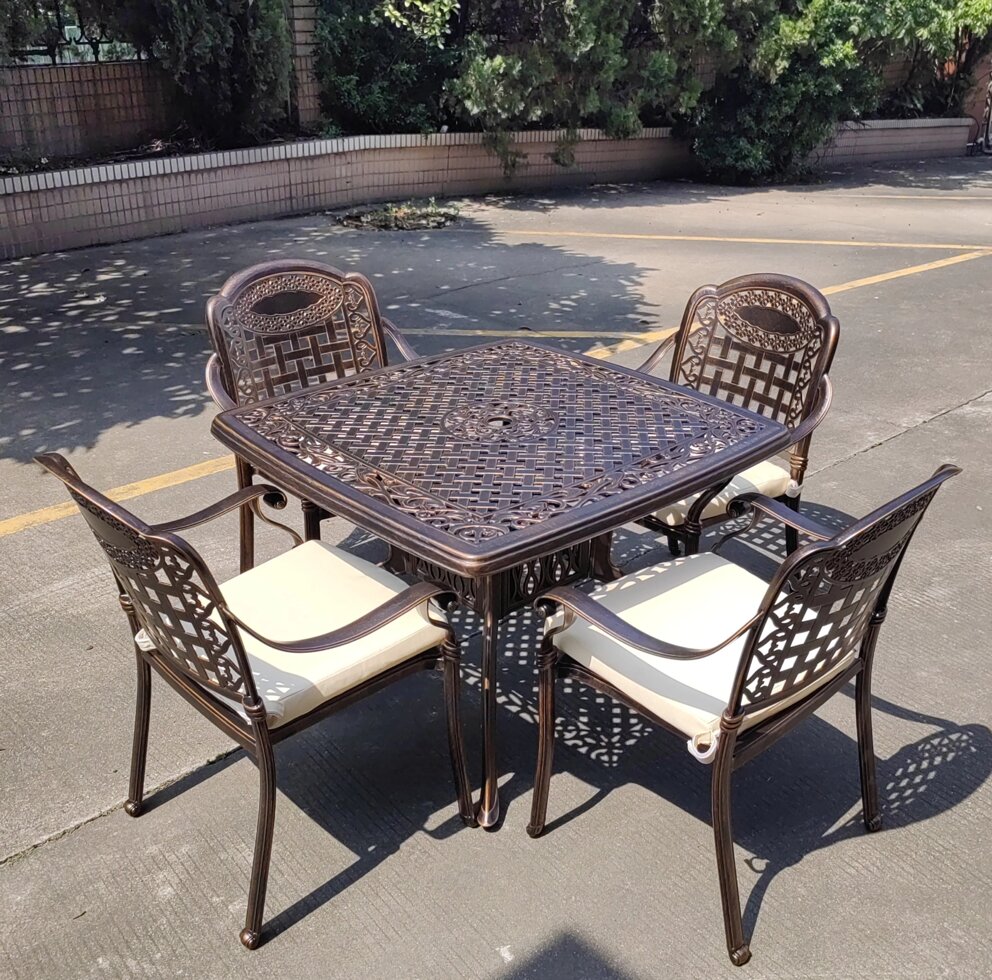 Обеденный комплект мебели Rossi из литого алюминия для тех, кто любит проводить время на природе и отдыхать в большой компании. Небольшой садовый стол на 4 персоны и 4 литых кресла можно поставить как на улице, так и в загородном доме. Данный комплект состоит из квадратного стола и 4 кресел с подушками.