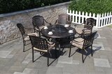 Металлический набор садовой мебели Sangay из литого алюминия со столом-мангалом рассчитан на компанию до 6 человек. Комплект литой металлической мебели из алюминия включает в себя стол-мангал диаметром 130 см и 6 стульев с подлокотниками и бежевыми подушками.