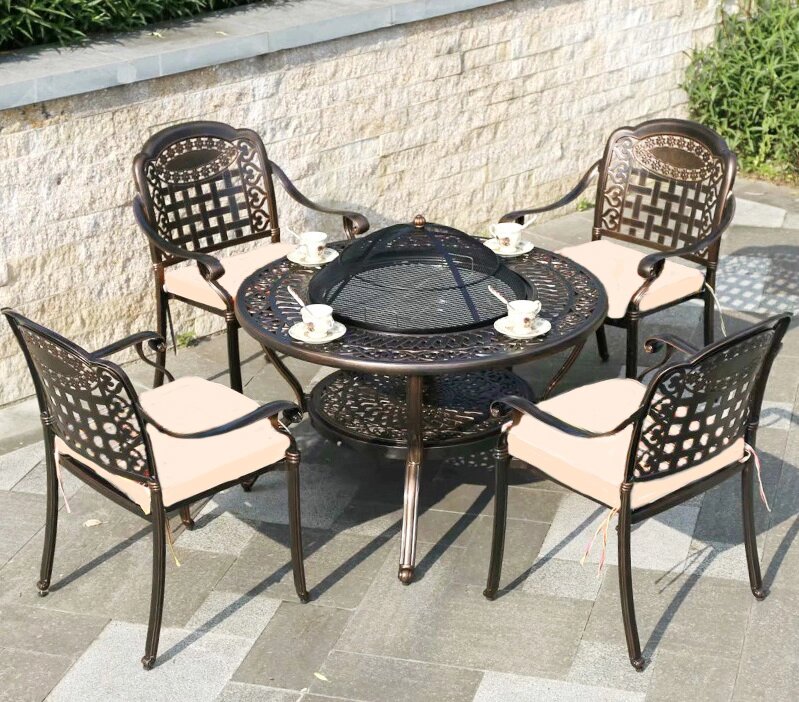 Комплект металлической мебели Vesuvius из литого алюминия со столом-мангалом выглядит очень эффектно. Купив такой набор садовой мебели из металла, можно самостоятельно готовить на углях не отходя от стола. Комплект садовой мебели из литого алюминия Vesuvius состоит из стола-мангала и 4 кресел с бежевыми подушками (фото 2).