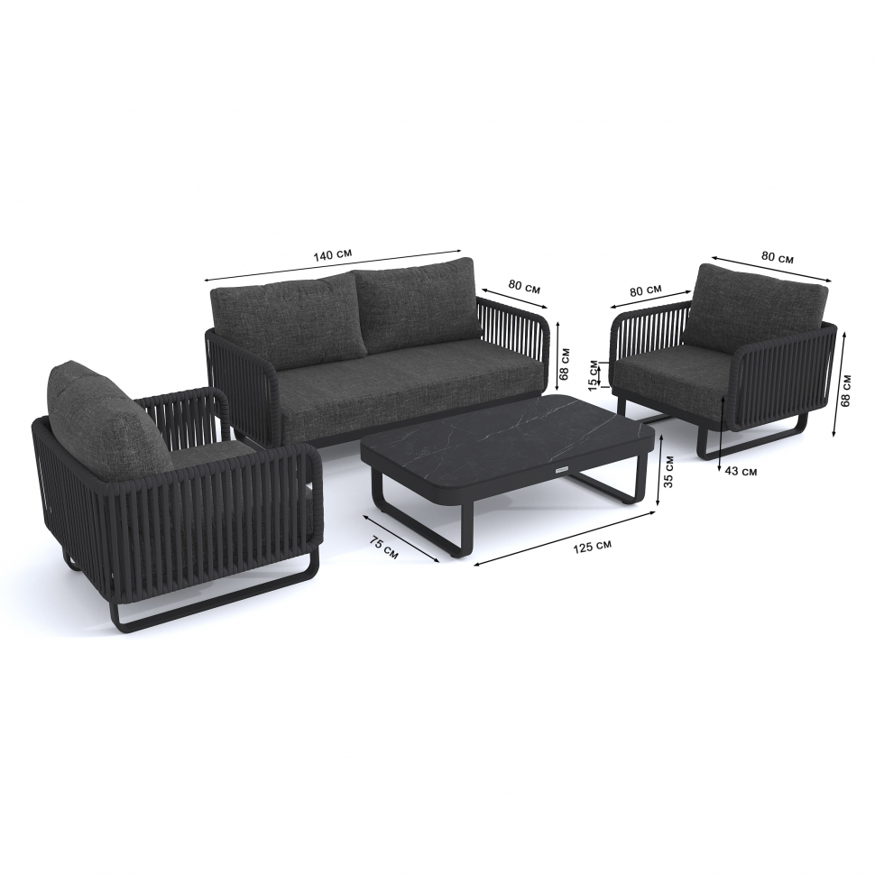 Материал: всесезонный алюминий с порошковым напылением, премиальная ткань для улицы, искусственный камень, веревочное плетение