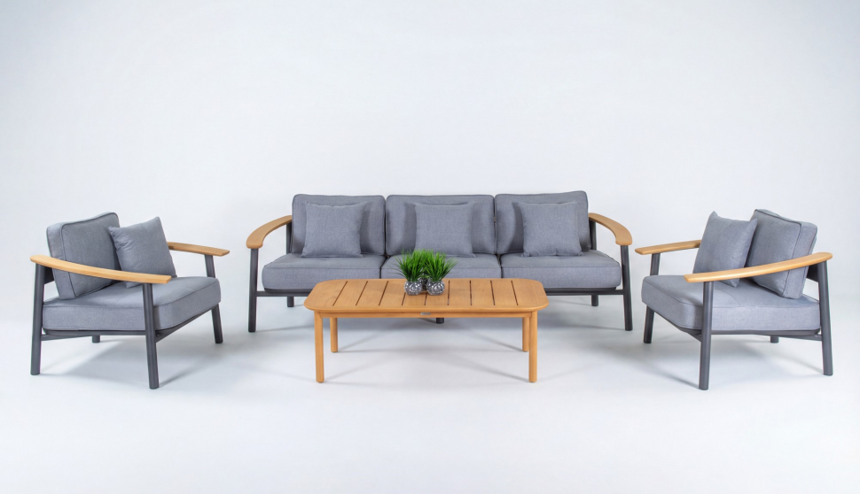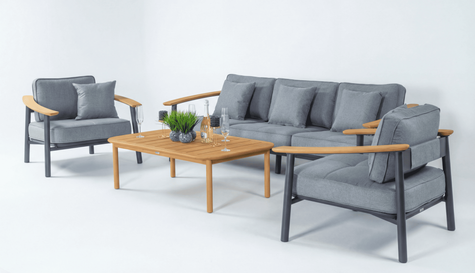 Мягкий трёхместный диван, большие кресла и журнальный (кофейный) столик из натурального тика - создать поистине уютное пространство для отдыха легко. Минимализм и сдержанная цветовая гамма, которую можно дополнить яркими акцентами в виде различных предметов декора. Чехлы светло-серого цвета идеально сочетаются с темно-серым каркасом. Они не выгорят на солнце и выдержат любые капризы погоды. Благодаря вшитой молнии их легко снять и почистить, если на них есть видимые загрязнения.