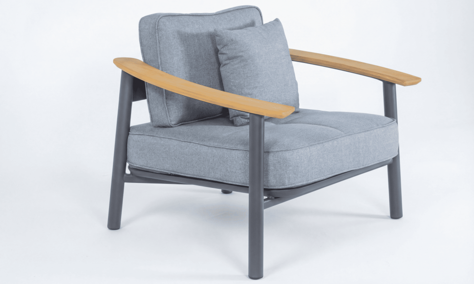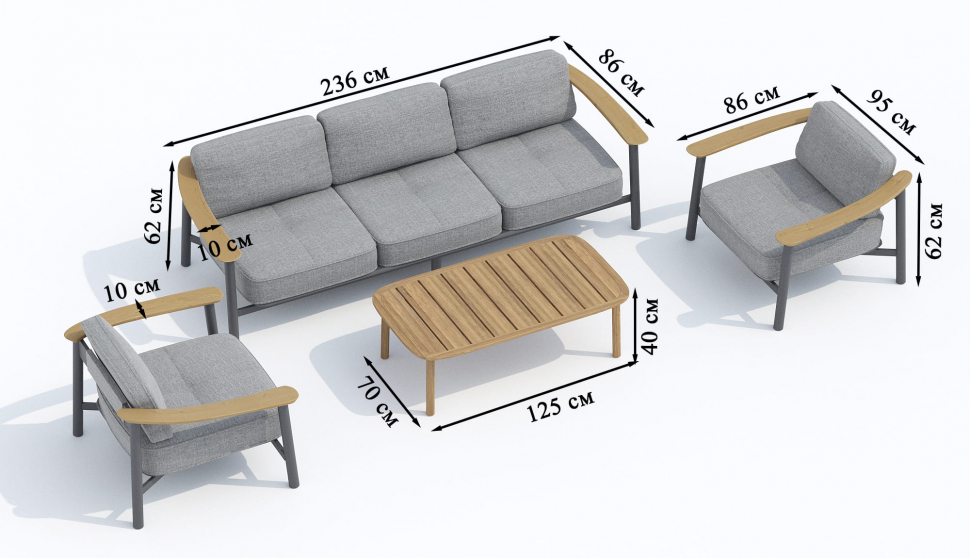 Цвет: каркас темно-серый карбон / подушки светло-серые / столешница натуральный тик