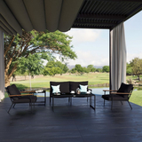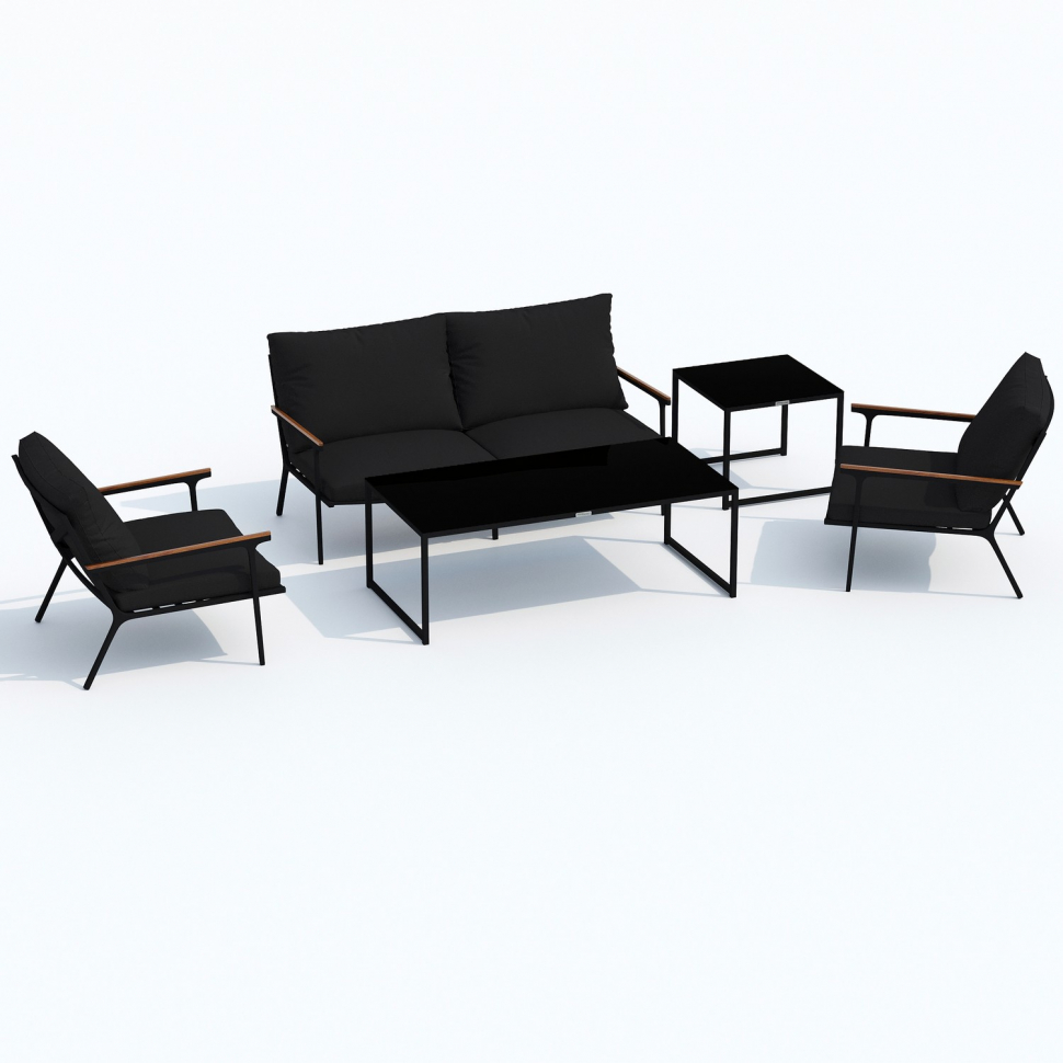 Мягкий двухместный диван, большие кресла и два журнальных столика со столешницей из чёрного глянцевого стекла - создать поистине уютное пространство для отдыха легко. Минимализм и сдержанная цветовая гамма, которую можно дополнить яркими акцентами в виде различных предметов декора. Чехлы чёрного цвета идеально сочетаются с таким же черным каркасом. Они не выгорят на солнце и выдержат любые капризы погоды. Благодаря вшитой молнии их легко снять и почистить, если на них есть видимые загрязнения.