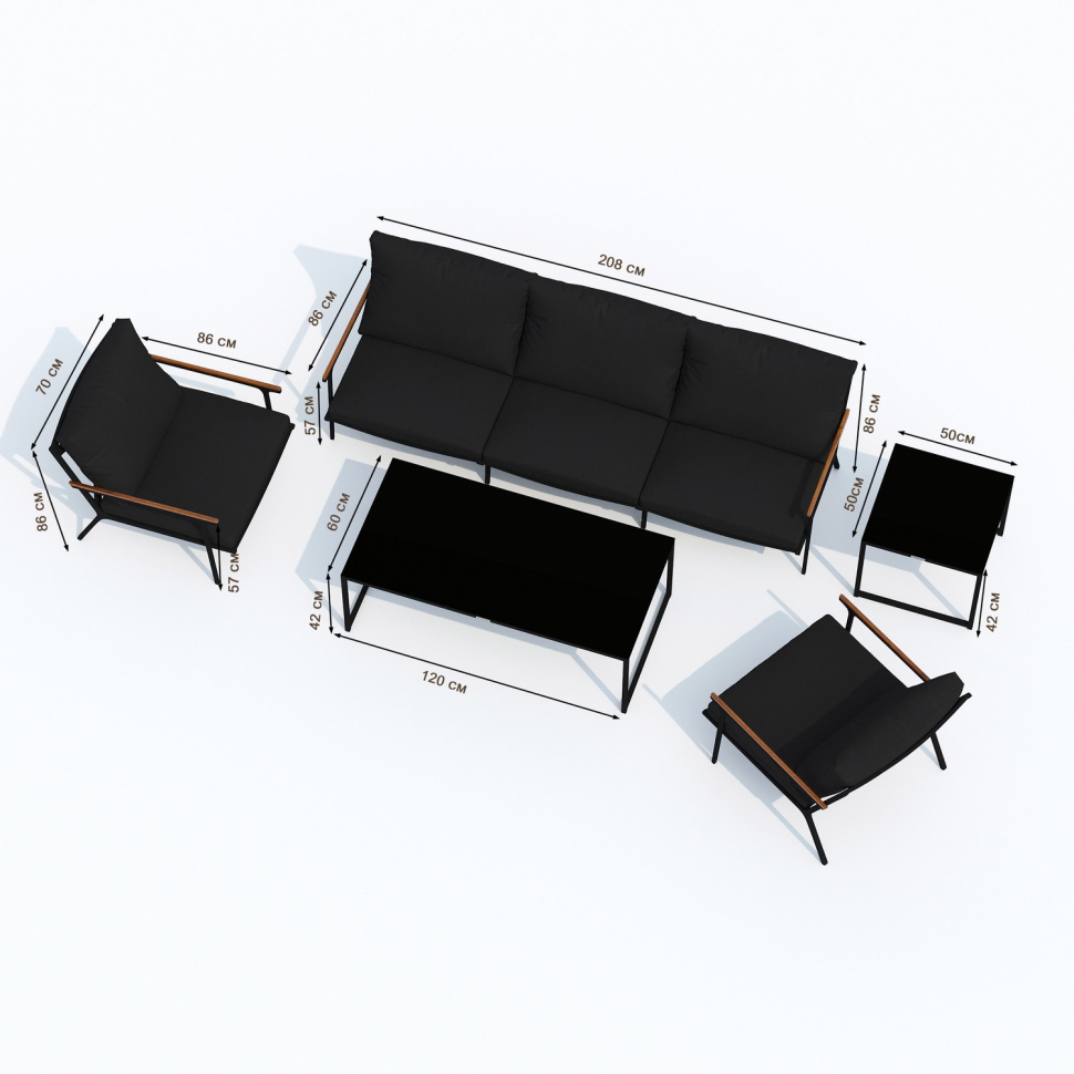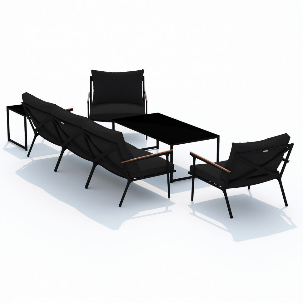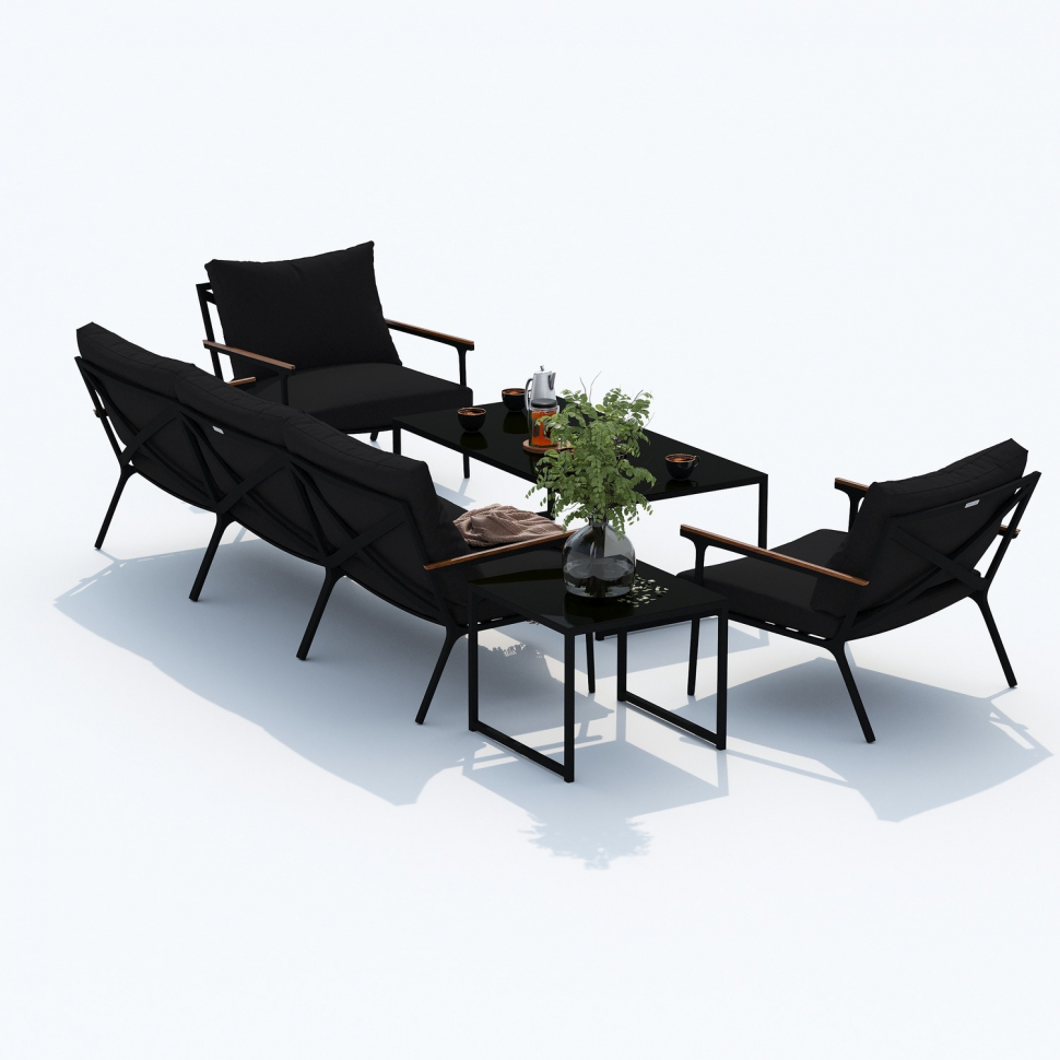 Мягкий трёхместный диван, большие кресла и два журнальных столика со столешницей из чёрного глянцевого стекла - создать поистине уютное пространство для отдыха легко. Минимализм и сдержанная цветовая гамма, которую можно дополнить яркими акцентами в виде различных предметов декора. Чехлы чёрного цвета идеально сочетаются с с таким же чёрным каркасом. Они не выгорят на солнце и выдержат любые капризы погоды. Благодаря вшитой молнии их легко снять и почистить, если на них есть видимые загрязнения.