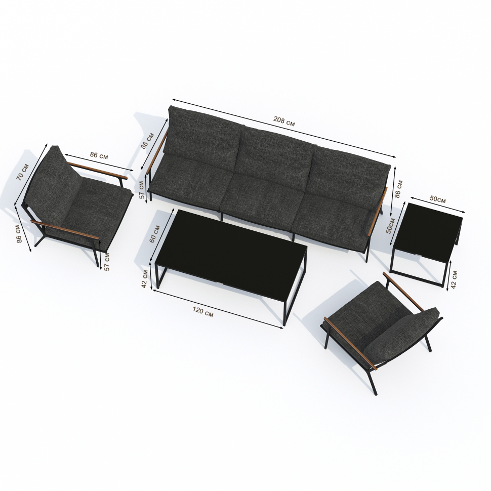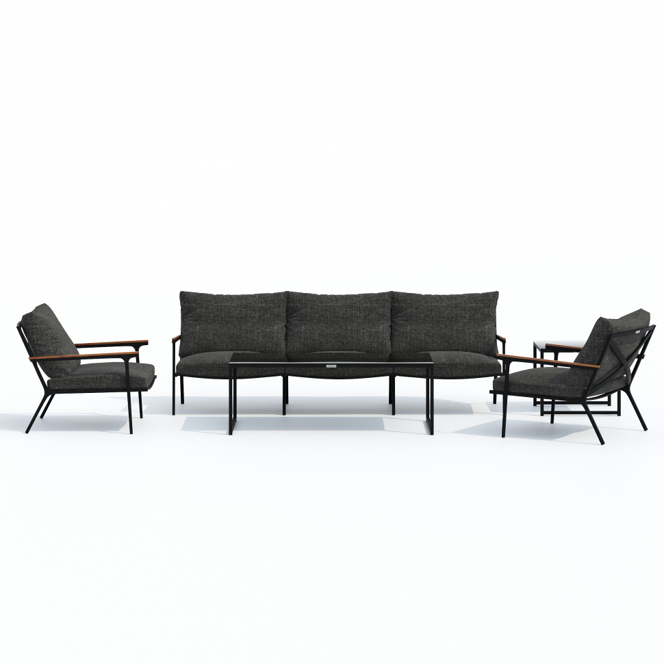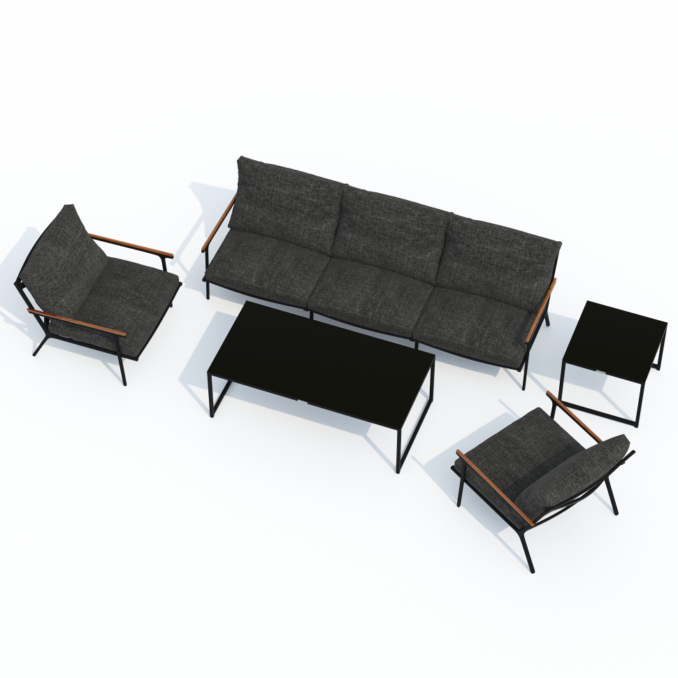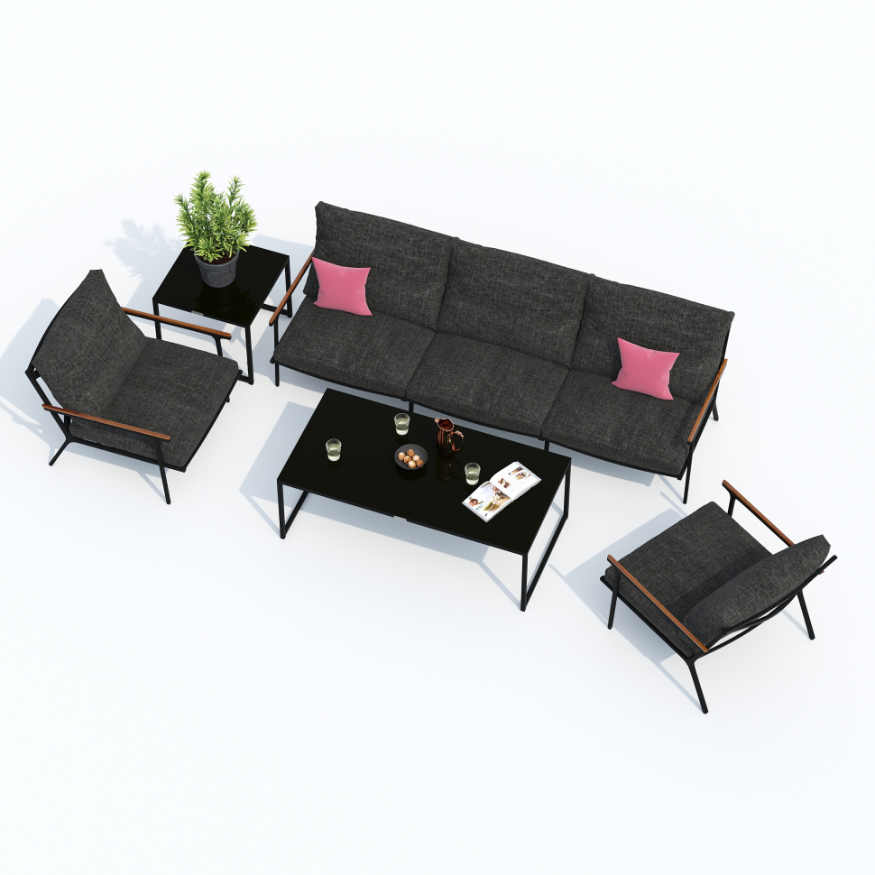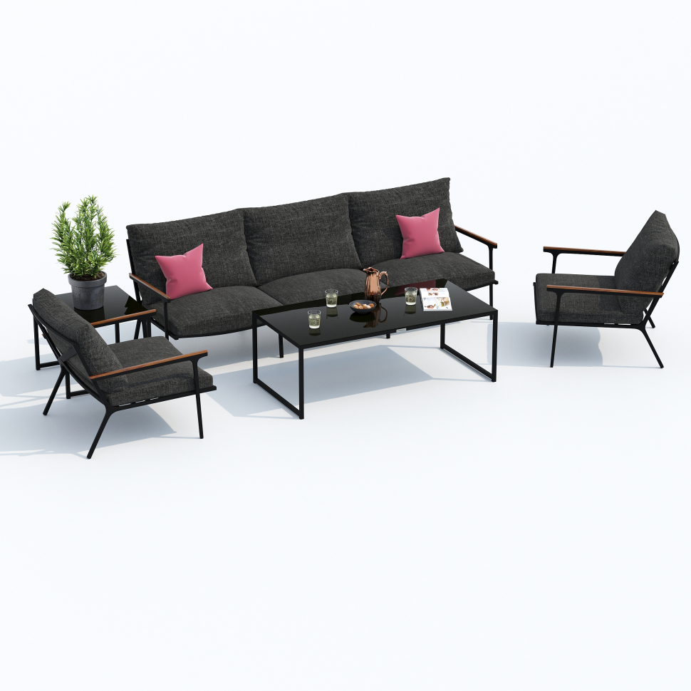 Мягкий трёхместный диван, большие кресла и два журнальных столика со столешницей из чёрного глянцевого стекла - создать поистине уютное пространство для отдыха легко. Минимализм и сдержанная цветовая гамма, которую можно дополнить яркими акцентами в виде различных предметов декора. Чехлы цвета маренго идеально сочетаются с темно-серым каркасом. Они не выгорят на солнце и выдержат любые капризы погоды. Благодаря вшитой молнии их легко снять и почистить, если на них есть видимые загрязнения.
