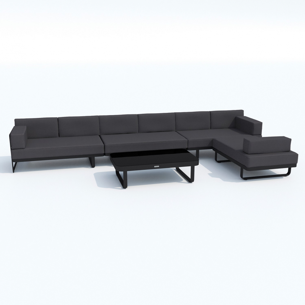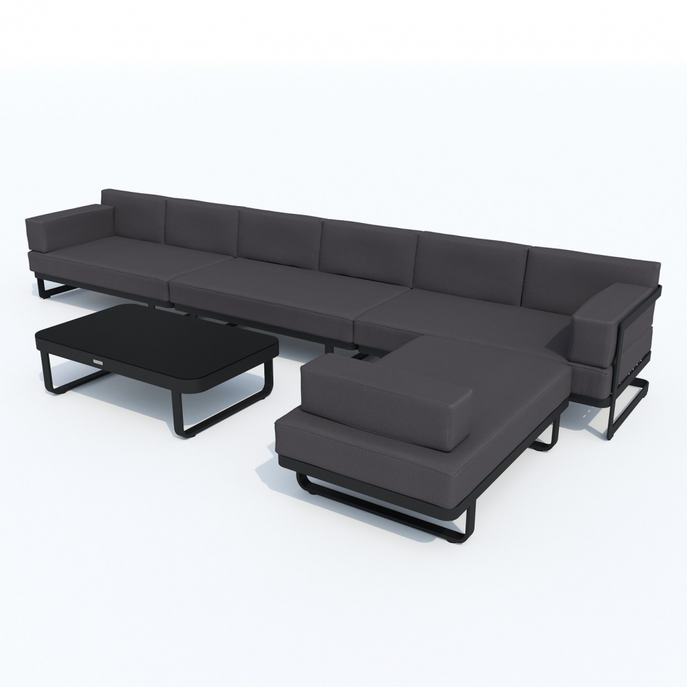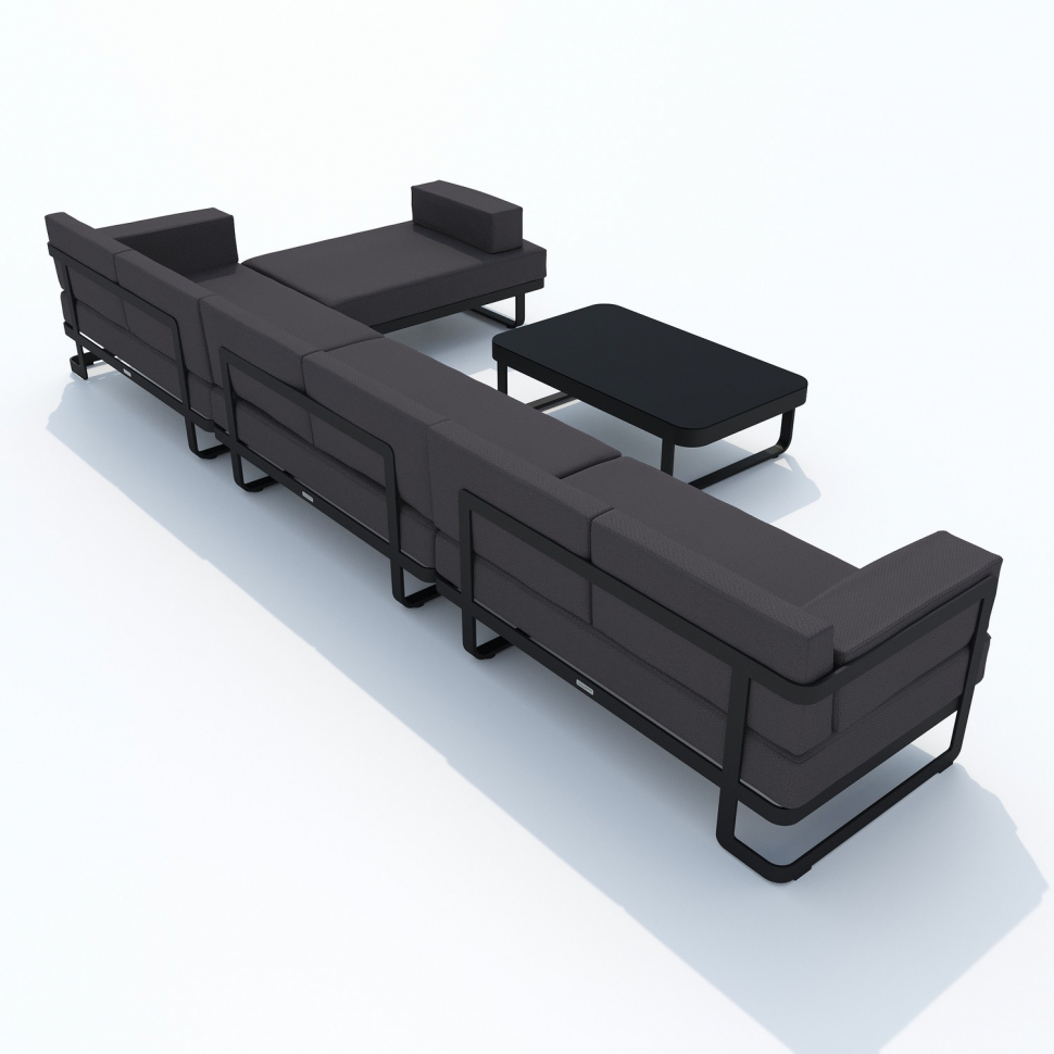 Лаунж зона состоит из трех больших и уютных диванов, а также огромного пуфа, которые по желанию можно расположить в различных комбинациях, например в форме буквы Г и по прямой линии. Лаунж зона также включает кофейный столик со столешницей из черного глянцевого стекла. Минимализм и сдержанная цветовая гамма впишутся любой стиль интерьера и будут дополнять композицию. Чехлы мебели цвета антрацит идеально сочетаются с темно-серым каркасом, подчеркивая строгий и лаконичный дизайн. Они не выгорят на солнце и выдержат любые капризы погоды. Их легко снять и почистить, если на них есть видимые загрязнения.